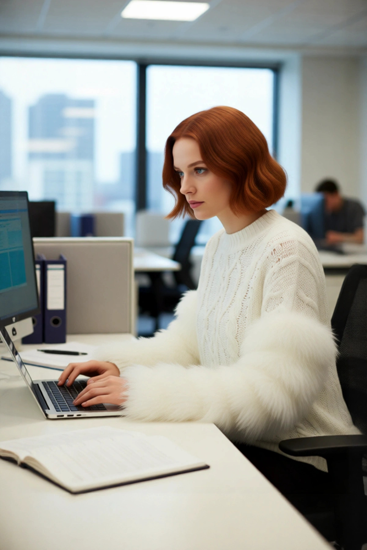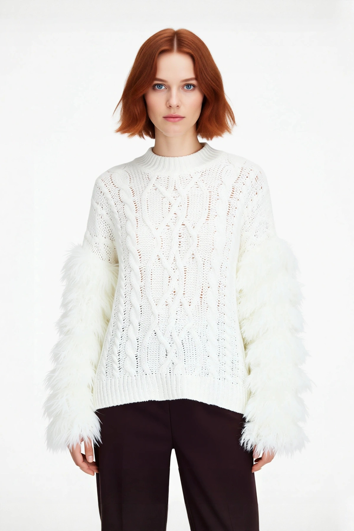 Ürün Özellikleri: Oversize kalıp, polyester akrilik materyal, saç örgü desen, bisiklet yaka, düşük kol, triko kumaş, ekru renk.
