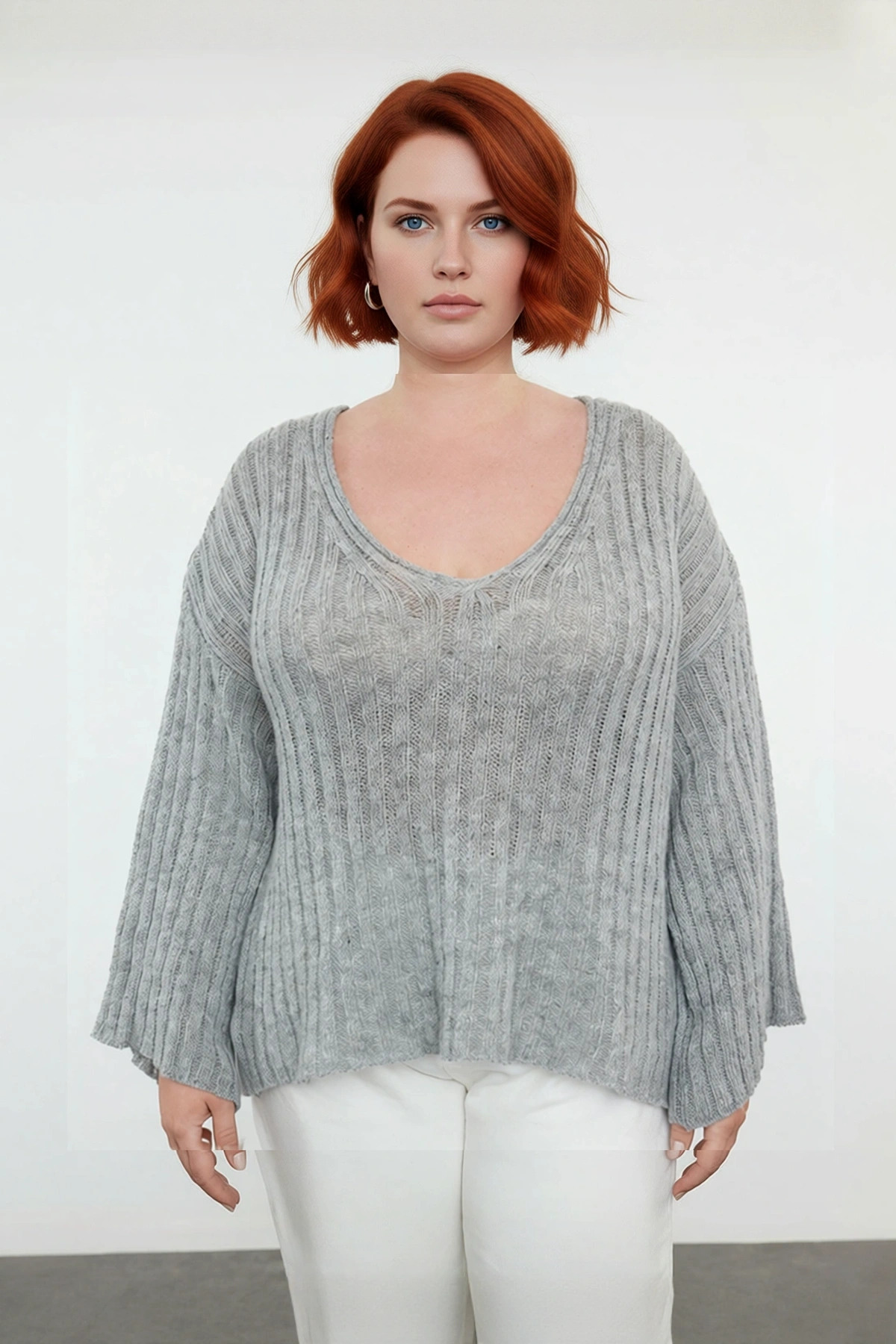 Ürün Özellikleri: Regular kalıp, yünlü karışım materyal, düz desen, V yaka, düşük kol, fitilli triko kumaş, gri renk.