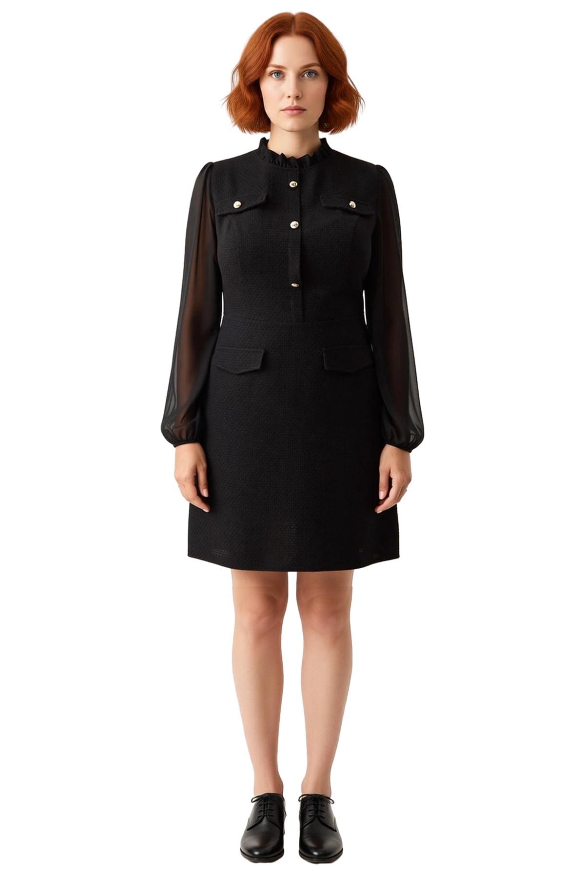 Bu kadın elbisesi, A-line kesimiyle vücuda nazikçe oturarak modern ve feminen bir duruş sergiler. Ana gövdesindeki tüvit dokusu, ilkbahar ve sonbahar serinliklerinde ideal bir sıcaklık sunarken, düz siyah rengi zamansız bir şıklık vadeder. Dik yaka formu klasik bir zarafet katarken, transparan şifon balon kolları elbiseye dinamik ve göz alıcı bir hava verir. Polyester, pamuk, viskoz, poliamid ve akrilik elyafların dengeli karışımı, gün boyu konfor ve dayanıklılık sağlar.