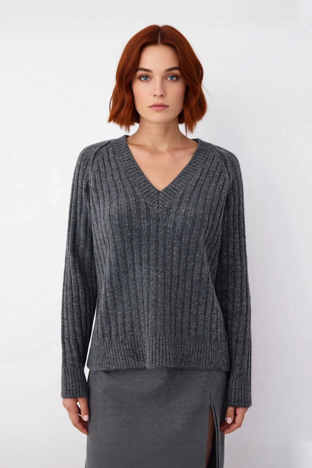 Ürün Özellikleri: Regular kalıp, akrilik ve polyester materyal, düz desen, V yaka, reglan kol, triko kumaş, gri renk.