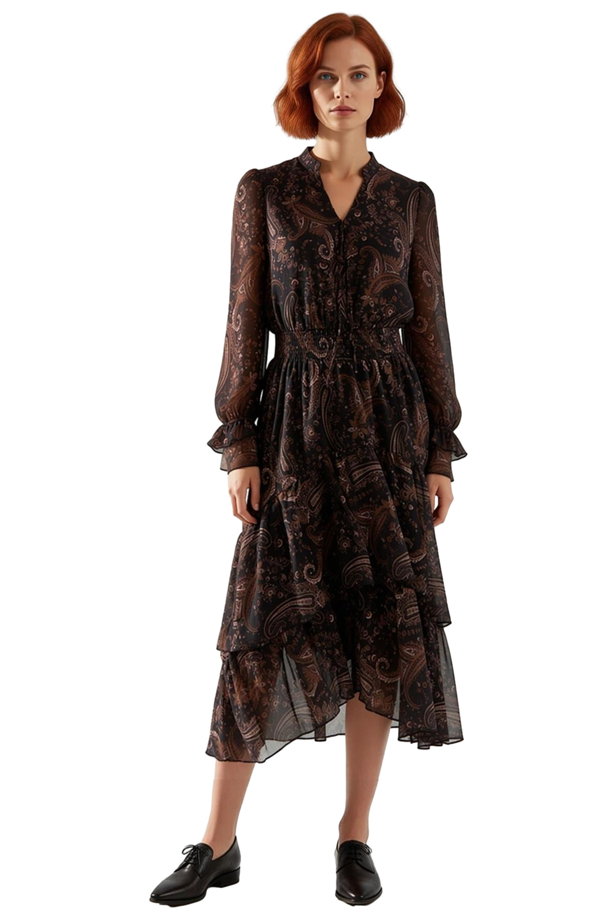 Elbisenin anahtar deliği yaka tasarımı, klasik şıklığı modern bir dokunuşla birleştirirken, balon kol tipi ve uzun kol boyu tasarıma hacim ve zarafet katar. Cepsiz ve baskısız olan bu tasarım, şal deseninin tüm ihtişamını ön plana çıkarır. Dokuma şifon kumaşın nefes alabilen yapısı, gün boyu süren rahatlık sağlarken, dayanıklı polyester materyali uzun ömürlü kullanım imkanı sunar. Bakım kolaylığı sağlayan makinede yıkanabilir özelliği sayesinde pratik bir kullanım deneyimi sunar.