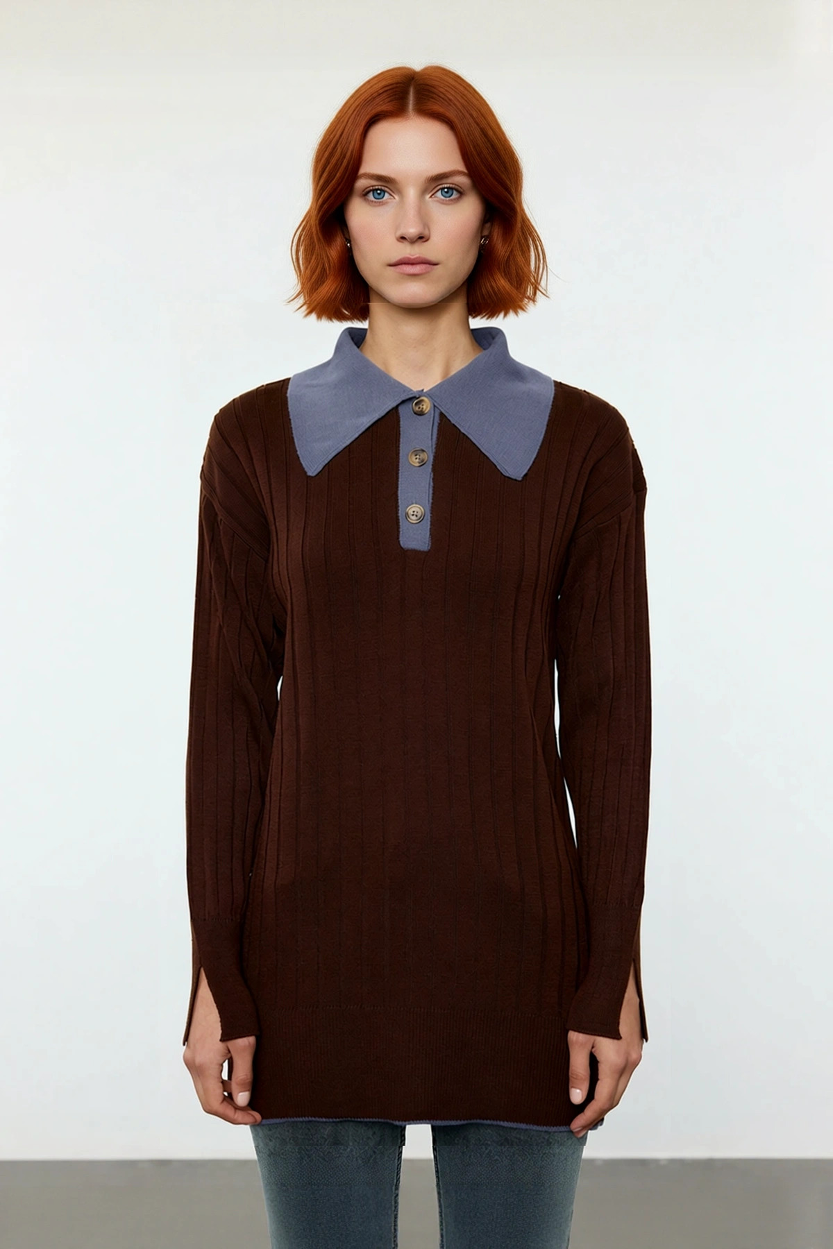 Ürün Özellikleri: Fitted kalıp, %100 akrilik materyal, dokulu desen, polo yaka, düşük kol, triko kumaş, kahverengi/mavi renk, yarım patlı tasarım.