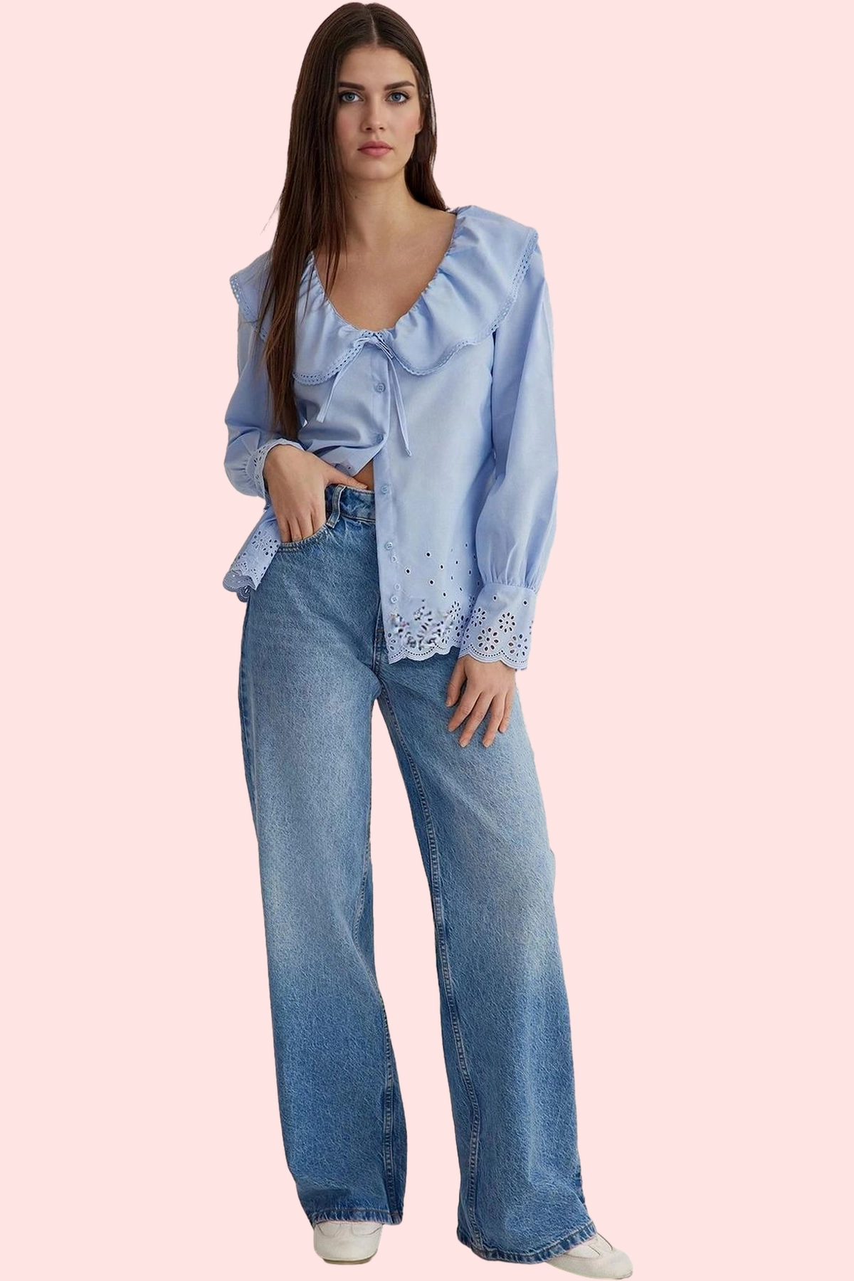 Günlük şıklığınıza modern bir dokunuş katacak, mavi uzun kollu kadın gömleğimizle tanışın! Bebe yakası ve düz tasarımıyla her ortama uyum sağlayan bu gömlek, rahat kalıbıyla gün boyu konfor sunar. Nefes alan kumaş yapısıyla sıcak havalarda bile serin kalmanızı sağlar. Özellikle yaz aylarında serin ve rahat kalmanızı sağlayacak hafif yapısı, şıklığıyla da göz doldurur. Hafta sonu kahvelerinizden akşam davetlerinize kadar her an yanınızda olacak bir stil parçası.