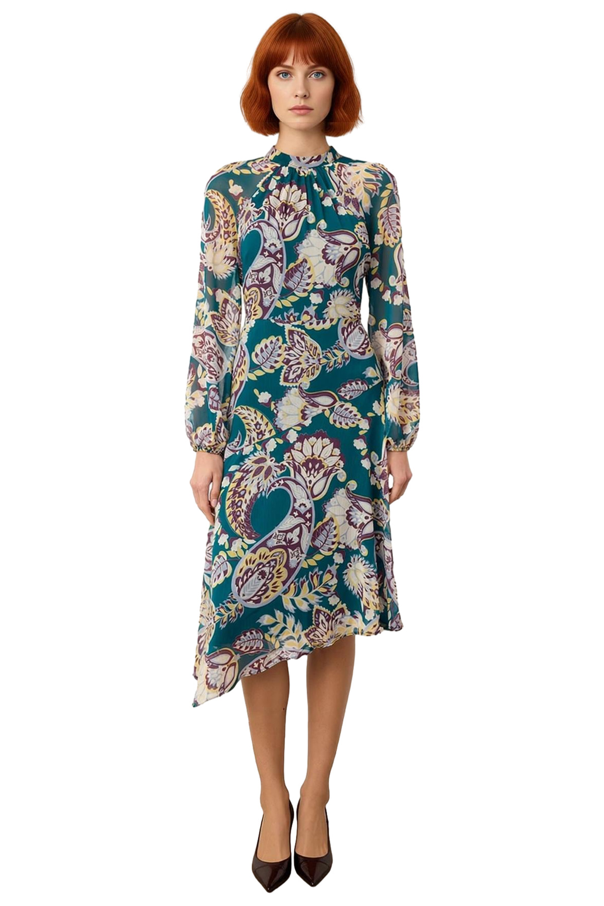 Ürün Özellikleri: A-line kalıp, %100 polyester materyal, şal desen, dik yaka, reglan kol, şifon dokuma kumaş, yeşil renk, astarlı tasarım.