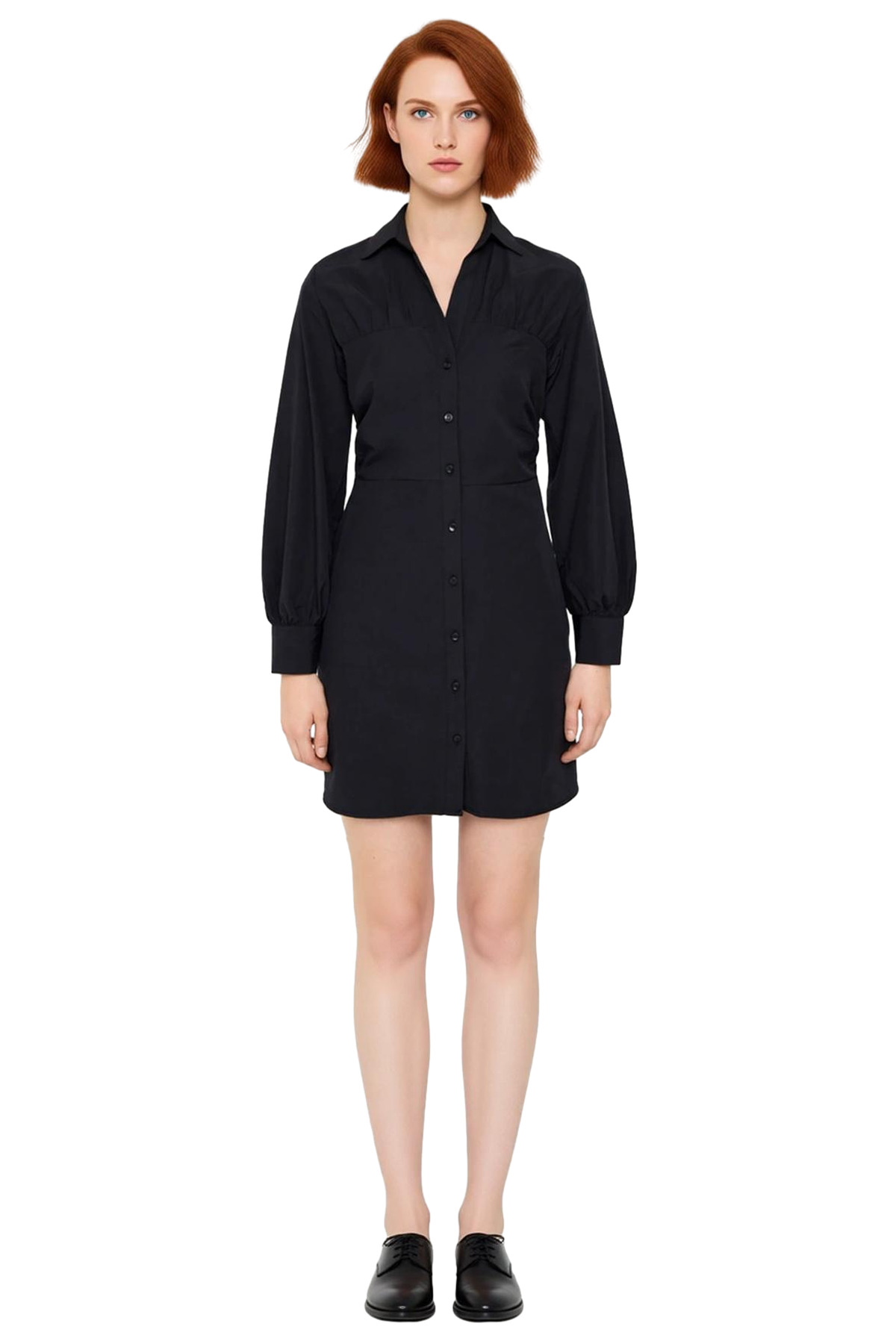 Ürün Özellikleri: A-line kalıp, pamuk polyester materyal, düz desen, kaçık yaka, düşük uzun kol, dokuma kumaş, siyah renk.