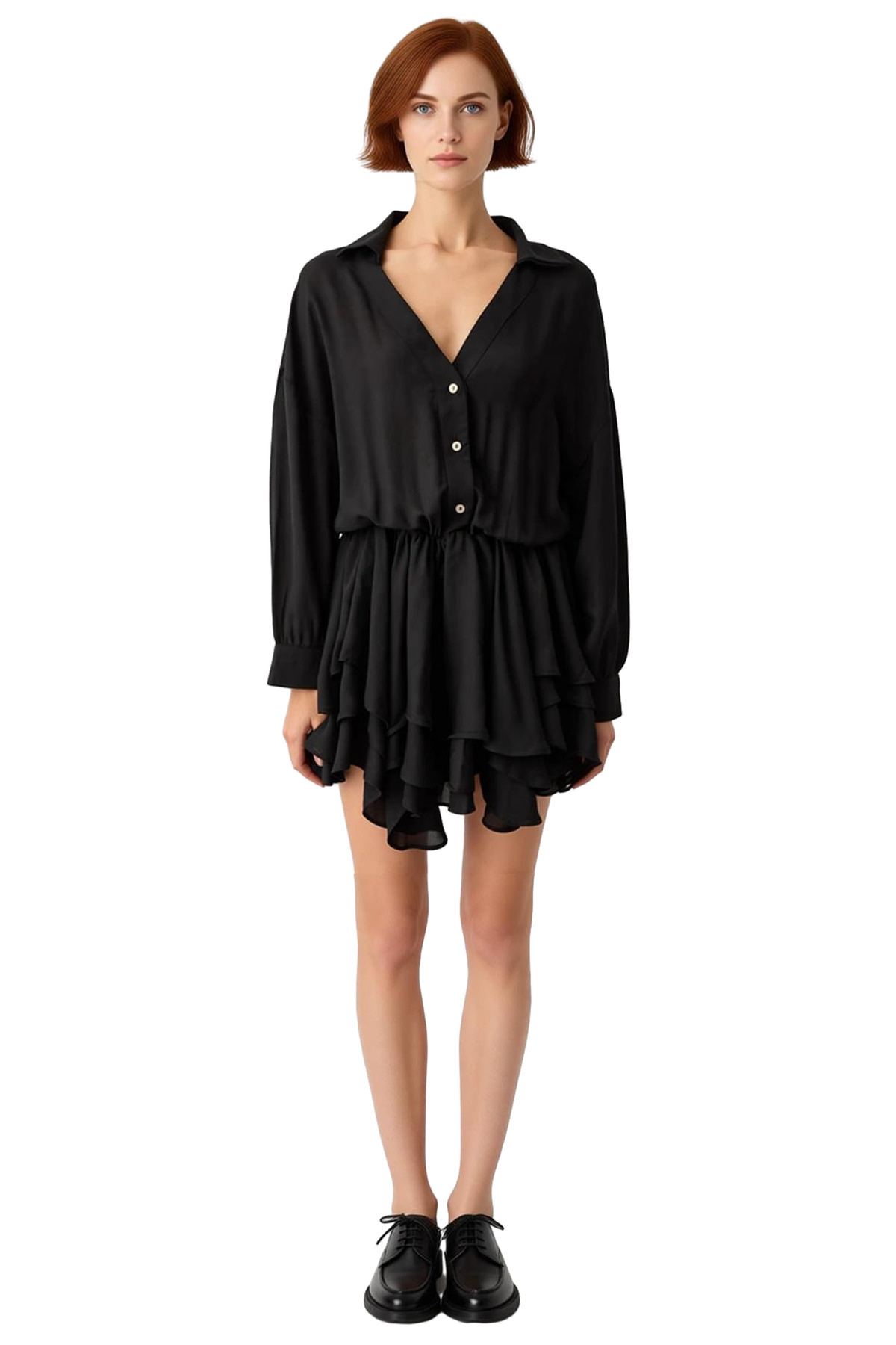 Ürün Özellikleri: Gömlek yaka, mini boy, düşük kol, uzun kol, skater kalıp, düz desen, siyah renk, şifon kumaş, %100 polyester, astarlı, günlük kullanım.