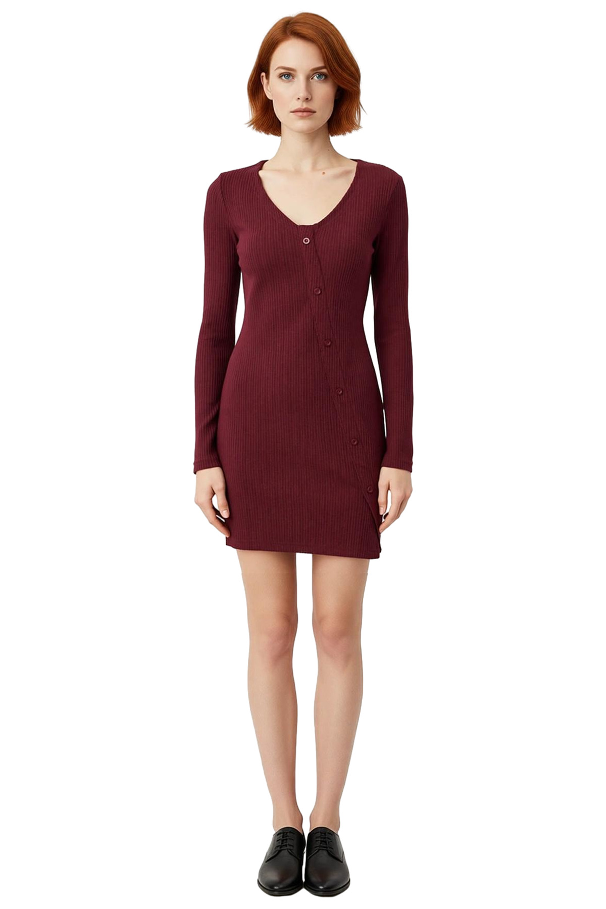Ürün Özellikleri: Bodycon kalıp, polyester viskoz elastan materyal, düz desen, V yaka, standart kol, örme kumaş, bordo renk, düğmeli tasarım.