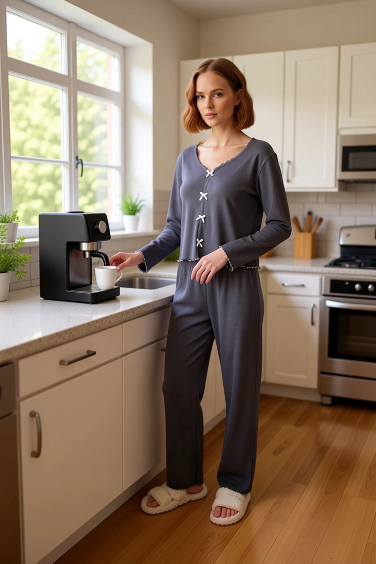 Bu şık kadın pijama takımı, ev giyiminde konfor ve estetiği bir araya getiriyor. Üst bölümdeki V yaka, zarif bir görünüm sunarken, önündeki sevimli kurdele fiyonk ve dantel detayları takıma hoş bir dokunuş katıyor. Fitilli örme kumaşın esnek yapısı, gün boyu rahatlık sağlarken, %95 pamuk ve %5 elastan içeriği cildinize yumuşaklık hissi veriyor. Düz gri rengi, her zevke hitap eden klasik bir seçenek sunuyor. Regular kalıbı ve basic silueti ile her vücut tipine uyum sağlayan bu takım, uzun kollu üstü ve boru paça pantolonu ile tam bir uyum içinde. Kaşkorse dokuma tekniği ile üretilmiş olup, solid görünümü ile dikkat çekiyor. Takımın V yaka üstü, önünde yer alan inci beyazı kurdele fiyonkları ve zarif dantel kenarları ile feminen bir hava taşıyor. Standart kesim uzun kolları, serin havalarda sıcaklık sağlarken, vücuda oturan ancak sıkmayan regular kalıbı hareket özgürlüğü sunuyor. Pantolonun normal bel ve boru paça kesimi, gün boyu rahat bir kullanım vadediyor. Bu pijama takımı, cool ve comfort persona ile tasarlanmış olup, lounge ve ev ortamları için ideal bir seçim. 2’li paket içeriği ile hem üst hem de alt parçayı bir arada sunuyor. Üretim yeri Türkiye olan bu ürün, kalitesiyle de öne çıkıyor. Kış mevsiminde evdeki rahat anlarınız için ideal olan bu pijama takımı, yumuşak tüylü terlikler ve pelüş bir sabahlık ile mükemmel bir uyum yakalıyor. Günlük kullanım için ise, antrasit rengi ile uyumlu bir jean pantolon ve basic bir tişört ile rahat bir sokak stili oluşturabilirsiniz. Bakımı için, ürünün dokusunu ve rengini korumak adına düşük sıcaklıkta ve hassas programda yıkama önerilir. Bu zarif ve konforlu pijama takımı ile evdeki her anınız daha keyifli hale gelecek.