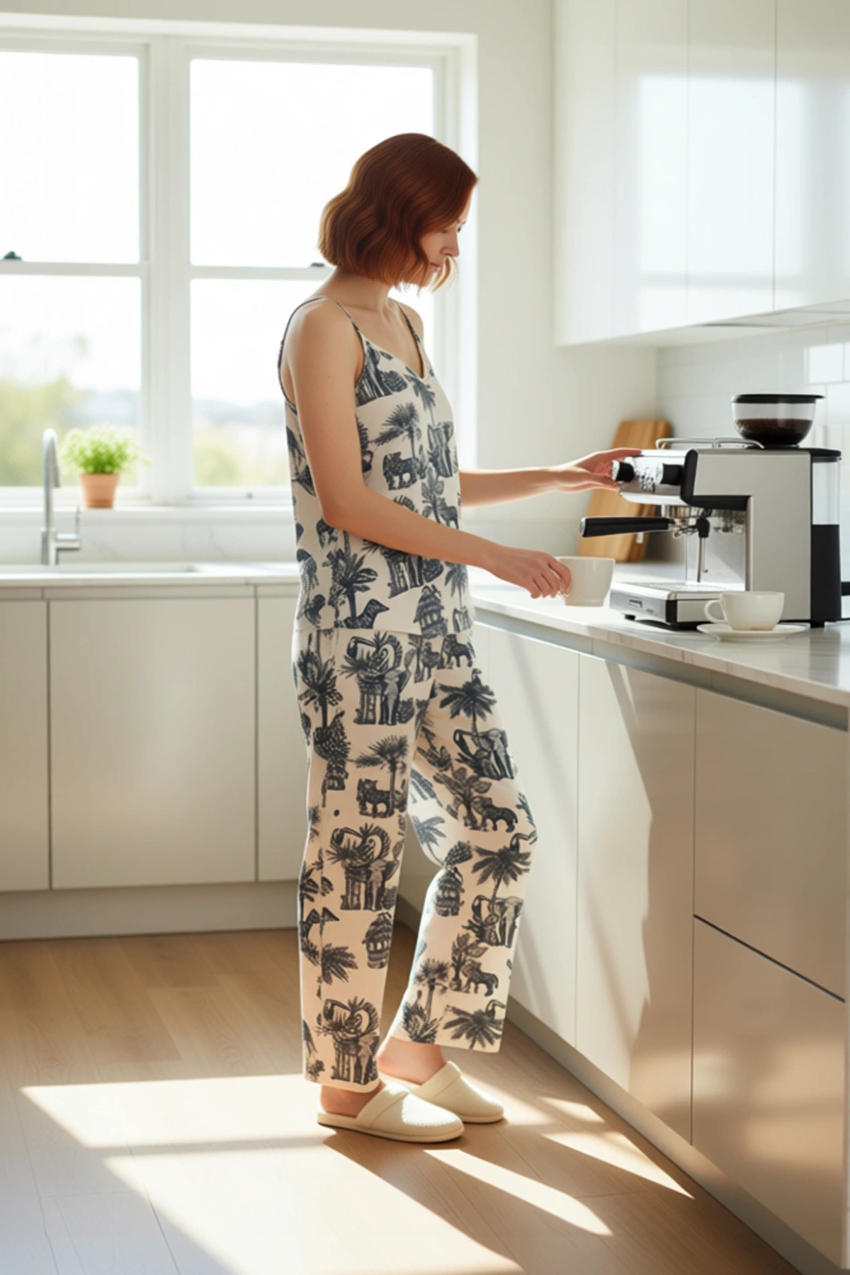 Bu kadın pijama takımı, %100 viskon kumaşıyla hem yumuşak hem de nefes alabilen bir yapı sunar. Ekru rengi üzerine yerleştirilmiş tropikal ve hayvan figürleri içeren özgün desen, takıma dinamik ve göz alıcı bir hava katıyor. Regular kalıbı sayesinde vücuda tam oturarak rahat bir kullanım sağlarken, dokuma kumaşın hafifliği hareket özgürlüğünüze katkıda bulunur. Viskonun doğal parlaklığı ve ipeksi dokusu, bu pijama takımını ev giyiminde lüks ve konforu bir arada arayanlar için ideal bir seçenek haline getiriyor. Metraj baskı tekniğiyle üretilen desen, canlılığını uzun süre koruyarak ürünün estetik değerini artırır. Bu takım, evde geçirdiğiniz zamanı daha keyifli ve stil sahibi kılmak için özenle tasarlandı. Üst kısmında zarif V yaka ve ince askılar bulunurken, alt kısımda boru paça ve normal bel detayı ile rahatlık ön planda tutulmuştur. Kolsuz üst, sıcak havalarda serinlik sağlarken, bol kesim pantolon hareketlerinizi kısıtlamaz. Viskonun cilde dostu yapısı, hassas ciltler için bile uygun olup, gün boyu süren bir konfor sunar. Bu pijama takımı, cool ve rahat bir persona yansıtırken, lounge ve ev ortamları için de biçilmiş kaftan. Hem uyku sırasında hem de evdeki aktivitelerinizde size eşlik edecek, stilinizden ödün vermeden rahat etmenizi sağlayacaktır. Bu pijama takımı, tüm mevsimlere uygun olmakla birlikte, özellikle ilkbahar ve yaz aylarında ferahlatıcı etkisiyle öne çıkar. Kombin önerisi olarak, evde rahat bir terlik veya yumuşak ev ayakkabıları ile tamamlanabilir. Dışarıda, üzerine salaş bir hırka veya şal alarak casual bir görünüm elde edebilirsiniz. Bakımı oldukça kolaydır; düşük sıcaklıkta makinede yıkanabilir ve ütüsü düşük ısıda yapılmalıdır. Ağartıcı maddelerden kaçınılması, ürünün ömrünü uzatacaktır. Bu sayede pijama takımınızın ilk günkü gibi kalmasını sağlayabilirsiniz.