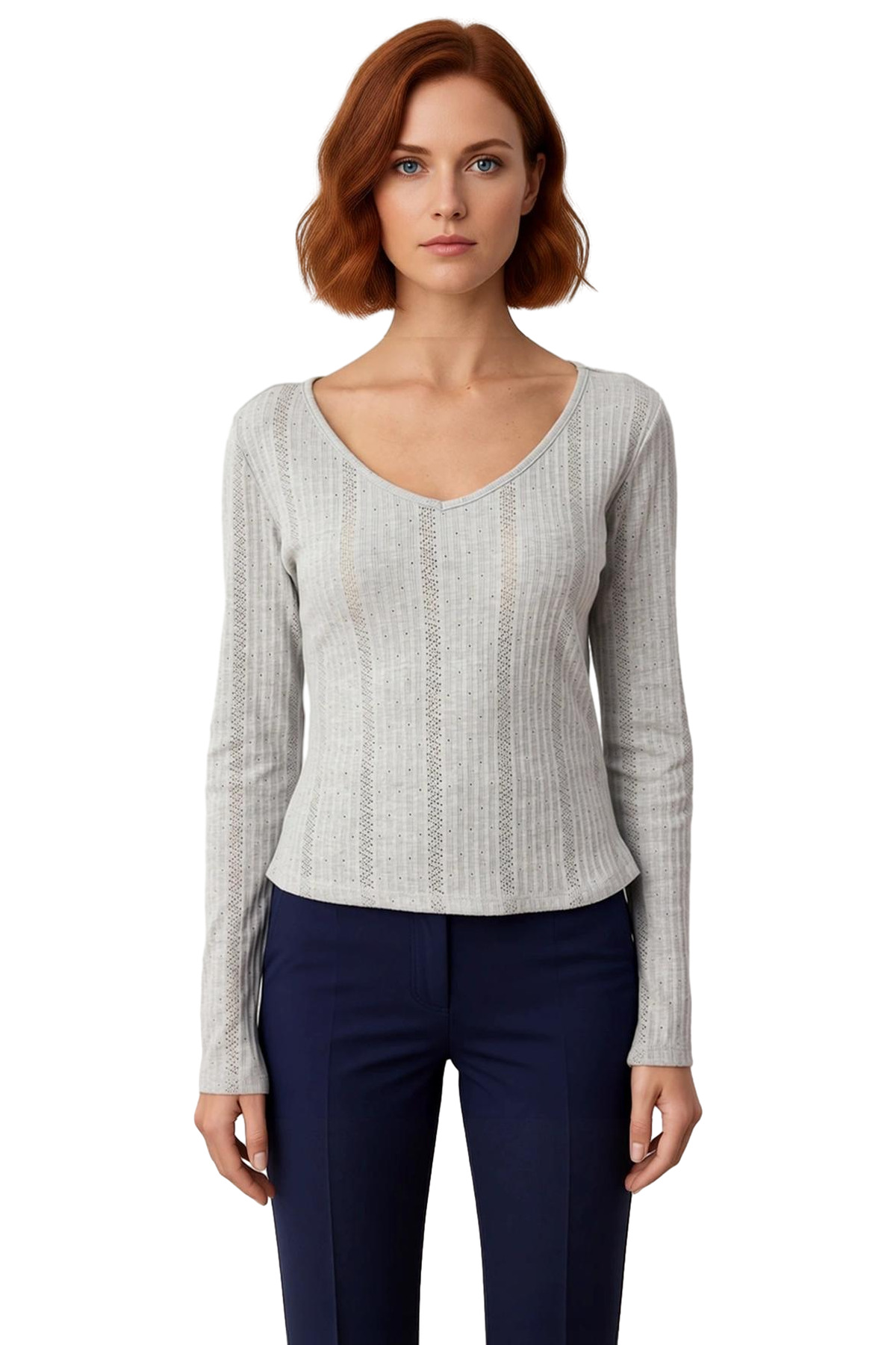 Bu kadın bluzu, şıklığı ve konforu bir arada sunan, vücuda oturan kesimiyle dikkat çekiyor. V yaka tasarımı, zarif bir görünüm sağlarken, uzun kolları serin havalarda ekstra koruma sunar. Ürünün örme kumaşı, esnek yapısıyla gün boyu hareket özgürlüğü tanır. Punto detayları, bluzun estetiğine sofistike bir dokunuş katarken, düz deseni sayesinde farklı kıyafetlerle kolayca uyum sağlar. %52 polyester ve %48 pamuk karışımı, kumaşa hem dayanıklılık hem de yumuşak bir his verir. Kaşkorse dokuma tipi, bluzun vücuda tam oturmasını ve formunu korumasını sağlar. Çıtçıt detayı, kullanım kolaylığı sunarken, ürünün fonksiyonelliğini de artırır. Bu bluz, casual ve günlük kullanıma uygun olup, kış sezonu için idealdir. Türkiye’de üretilen bu ürün, kaliteli işçiliğiyle öne çıkar. Yıkama talimatlarına dikkat edildiğinde, uzun yıllar boyunca ilk günkü gibi kalacaktır. Bu bluz, hem günlük hayatta hem de daha özel anlarda şık ve rahat olmak isteyen kadınlar için mükemmel bir seçenektir. Farklı alt giyim seçenekleriyle kolayca kombinlenebilen bu parça, gardırobunuzun kurtarıcılarından biri olacaktır. Regular boyu, çoğu vücut tipine uyum sağlayacak şekilde tasarlanmıştır. Bu bluz, sadece bir giyim ürünü olmanın ötesinde, kişisel stilinizi yansıtmanın bir aracıdır. Yumuşak dokusu ve rahat kalıbı, kendinizi iyi hissetmenizi sağlayacaktır. Bu ürün, estetik ve fonksiyonelliği bir araya getiren modern bir kadının tercihi olacaktır. Ürünün her detayı, kullanıcı deneyimini en üst düzeye çıkarmak için özenle düşünülmüştür. Bu bluz, beklentilerinizi fazlasıyla karşılayacak bir üründür.