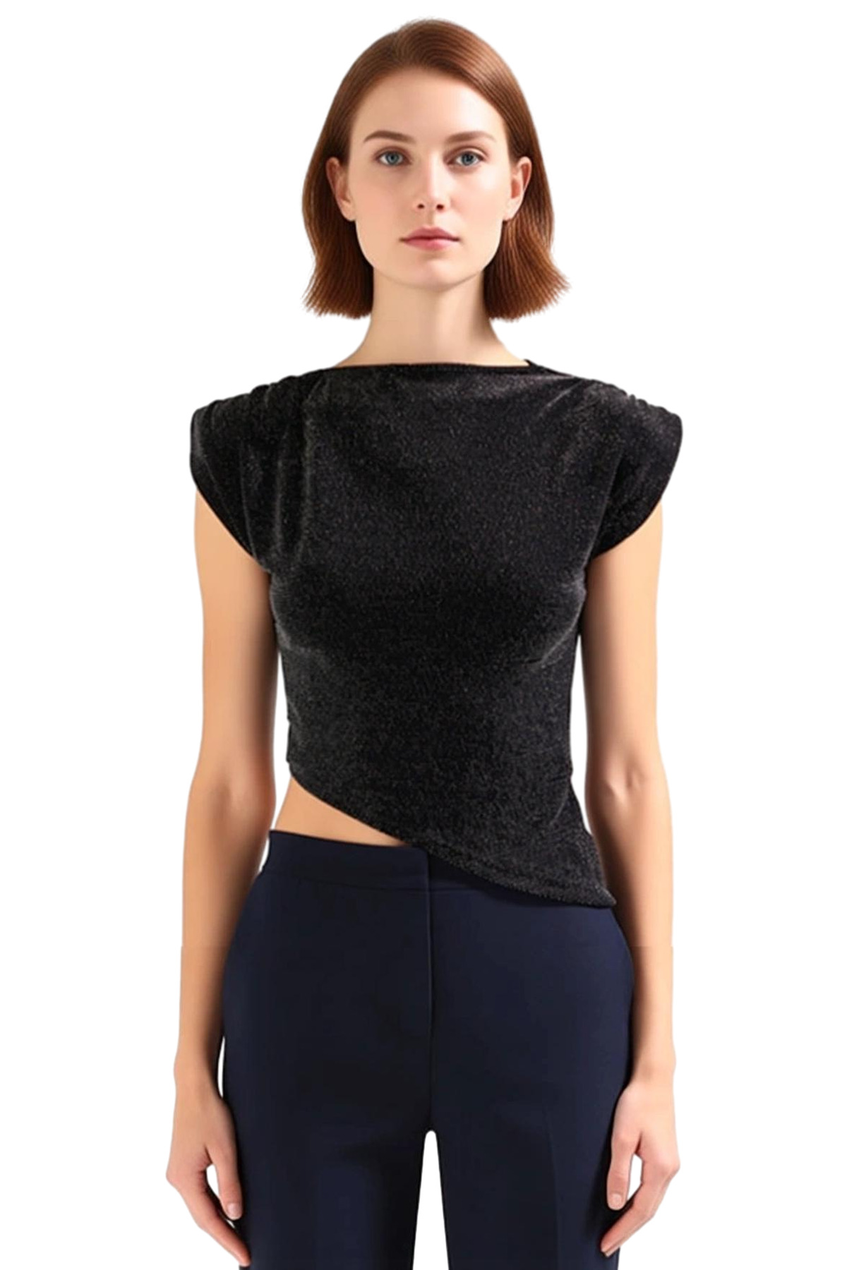 Bu özel tasarım bluz, modern ve sofistike bir stil arayan kadınlar için idealdir. Kayık yaka kesimi, zarif bir dekolte sunarken, omuzlardaki vatkalar, giysiye belirgin bir yapı ve şık bir duruş kazandırır. Kolsuz olması, özellikle yaz aylarında veya daha hafif bir görünüm istenen durumlarda tercih edilebilir. Ürünün ana materyali poliamid karışımlı olup, esnekliği ve dayanıklılığı ile bilinir. Bu temel malzemenin yanı sıra, elastan içeriği giysiye hareket kabiliyeti ve vücuda uyum sağlama özelliği katar. En dikkat çekici özelliği ise metalize ipliklerin kullanıldığı simli örme dokusudur. Bu doku, ışığı yansıtarak ürüne zarif bir parlaklık ve lüks bir hava katar. Bu sayede bluz, hem gündüz şıklığı hem de gece davetleri için uygun bir seçenek haline gelir. Fitted kalıbı, vücut hatlarını güzelce vurgulayarak modern bir silüet oluşturur. Düz desenli olmasına rağmen, kullanılan metalize iplikler sayesinde kumaşın kendisi bir desen görevi görür. Ürün tipi olarak basic bir kesime sahip olsa da, detayları ve dokusuyla öne çıkar. Şık ve gece ortamları için tasarlanmış koleksiyonun bir parçasıdır. Kemer veya kuşak gibi ek aksesuarlar içermez, bu da sade ve zarif görünümünü pekiştirir. Tüm sezonlarda kullanıma uygun olan bu bluz, %93 Poliamid, %4 Elastan ve %3 Metalize İplik içeriğine sahiptir. Bakım talimatı Hassas Yıkama olarak belirtilmiştir. Bu ürün, şıklığı ve konforu bir arada sunarak, her kadının gardırobuna değer katacak bir parçadır. Üretim yeri Türkiye’dir.