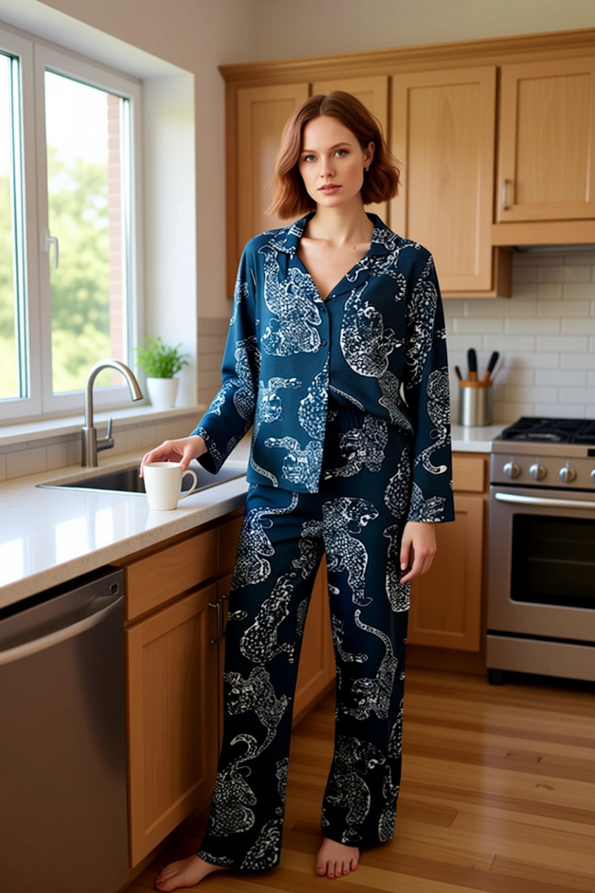 Kadın Viskon Dokuma Pijama Takımı Kaplan Desenli Antrasit Fonksiyonel Dayanıklı Kaliteli Şık