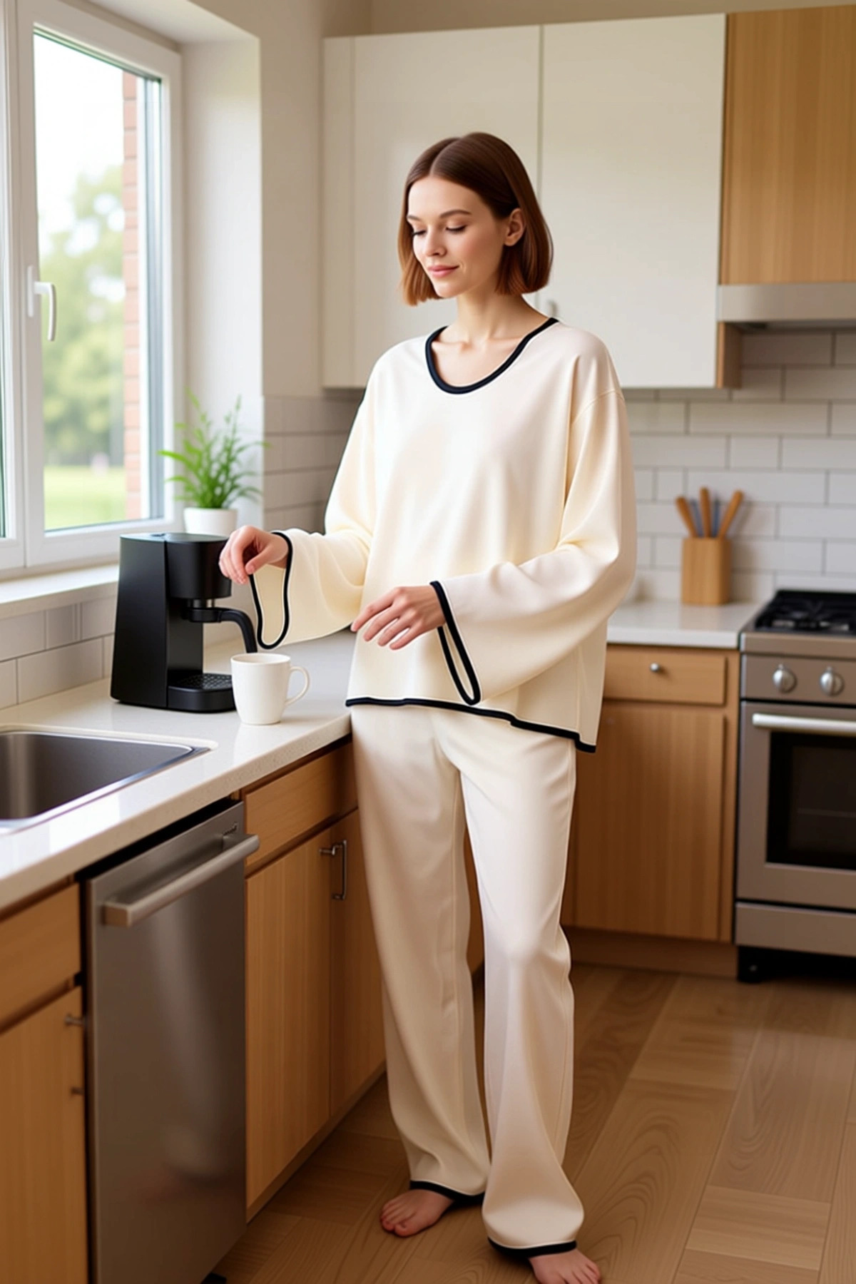 Bu zarif pijama takımı, ev giyiminde şıklığı ve konforu bir araya getiriyor. %100 viskon kumaşı, cildinize nefes aldıran ve yumuşak bir dokunuş sunan üstün kalitede bir materyaldir. Düz ekru rengi, zamansız bir zarafet sunarken, shally dokuma tipi kumaşa hoş bir doku ve derinlik katıyor. Regular kalıbı, vücudu nazikçe saran ve hareket özgürlüğü sağlayan bir kesime sahiptir. Boru paça pantolon ve uzun kollu üst, klasik pijama estetiğini modern bir yorumla sunar. Bu takım, lounge ve ev ortamları için mükemmel bir seçimdir ve cool & comfort kişiliğinizi yansıtacaktır. Üst kısmındaki kaçık yaka ve kol uçlarındaki kontrast biyeler, tasarıma sofistike bir dokunuş ekleyerek sıradanlıktan uzaklaştırır. Üst kısmın kaçık yaka detayı, boyun bölgesinde rahat bir his yaratırken, düşük kol kesimi ve uzun kolları, hareket kabiliyetinizi kısıtlamadan konfor sunar. Regular kalıbı, her bedene uyum sağlayabilen esnek bir yapıya sahiptir. Normal bel pantolon, gün boyu süren bir rahatlık sağlarken, %100 viskon materyali, cildinizle nazikçe bütünleşir. Dokuma kumaşın doğal dökümü, pijama takımına akıcı bir görünüm kazandırır. Shally dokuma tipi, kumaşa özgün bir doku kazandırarak ürünün estetik değerini artırır. Bu pijama takımı, evde geçirdiğiniz her anı daha keyifli ve konforlu hale getirmek için özenle tasarlanmıştır. Kış mevsiminde evde rahat ve şık vakit geçirmek isteyenler için ideal olan bu pijama takımı, sıcak tutma özelliği ile de öne çıkar. Kombin önerisi olarak, yumuşak ev terlikleri veya pelüş panduflar ile mükemmel uyum sağlar. Üzerine alacağınız şık bir sabahlık veya rahat bir hırka ile de tamamlayabilirsiniz. Bakımı için, ürün etiketindeki yıkama talimatlarına dikkat etmek önemlidir. %100 viskon kumaşın ömrünü uzatmak için, soğuk su ile elde yıkama veya hassas makine programı tercih edilmelidir. Düşük ısıda ütüleme, kumaşın formunu korumasına yardımcı olacaktır.