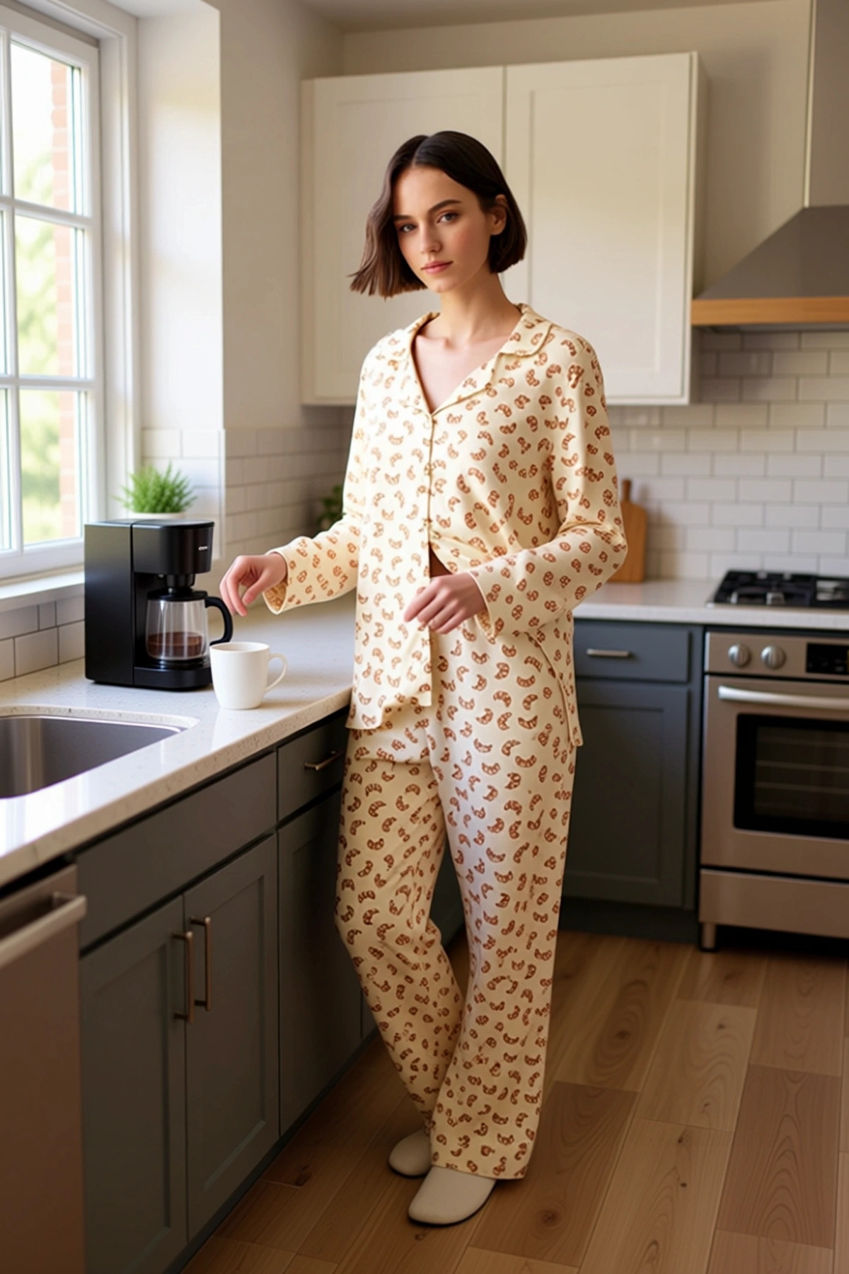 Kadın Viskoza Baskılı Pijama Takımı Gömlek ve Pantolon Uzun Kollu Fonksiyonel Dayanıklı Şık