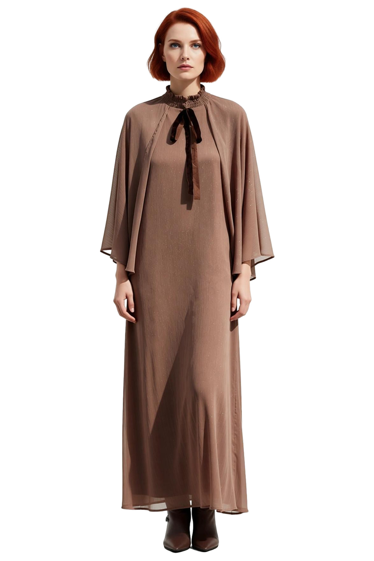Elbisenin fırfırlı dik yaka detayı, boyun bölgesine şık bir zarafet katarken, standart uzun kolları pelerinli dış katmanla mükemmel bir uyum içindedir. Bu kombinasyon, hem rahat hareket imkanı sunar hem de dinamik ve etkileyici bir siluet oluşturur. Dokuma yoryo şifon kumaşın hafifliği ve parlaklığı, elbisenin her hareketinizde büyüleyici bir akışkanlık sergilemesini sağlar. Cepsiz ve kemersiz tasarımı, elbisenin sade ve zarif çizgisini koruyarak aksesuar kullanımına geniş alan tanır. Özel günler için ideal olan bu parça, bakımı kolay yapısıyla da pratiklik sunar.