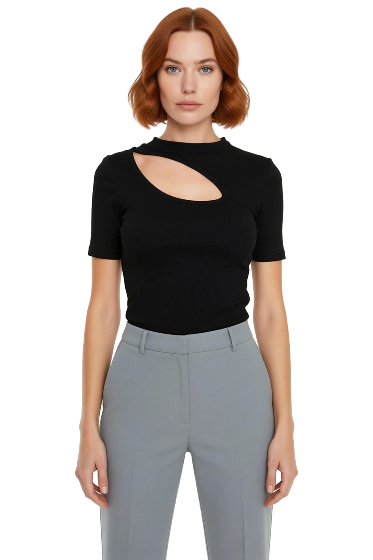 Modern stili ve konforu bir araya getiren bu kadın bluzu, cut out detayıyla dikkat çekiyor. Fitted kalıbı sayesinde vücuda mükemmel uyum sağlayarak zarif bir siluet sunar. Bisiklet yaka tasarımı, hem klasik bir şıklık katıyor hem de rahat bir kullanım imkanı sunuyor. %70 polyester, %29 pamuk ve %1 elastan içeren karışımı, bluzun hem dayanıklı hem de esnek olmasını sağlıyor. Örme kumaş ve rejenere kaşkorse dokuma tipi, bluzun yumuşak dokusunu ve formunu korumasını sağlıyor, bu da özellikle yaz ayları için ideal bir seçim olmasını destekliyor.Standart kol yapısı ve crop boyu, bu bluzu genç ve dinamik bir görünüm arayanlar için cazip kılıyor. Siyah rengi ve düz deseni, her türlü kombinle kolayca uyum sağlamasına olanak tanıyor. Casual ve günlük koleksiyonun bir parçası olan bu bluz, özellikle cool ve rahat bir stil benimseyen kadınlar için tasarlandı. Cepsiz ve kemersiz yapısı, bluzun sade ve şık çizgisini vurguluyor. Kolay bakımı sayesinde, günlük kullanım için pratik bir seçenektir.Bu bluz, farklı vücut tiplerine uyum sağlayan kesimiyle öne çıkıyor. Kot pantolonlar, şortlar, etekler veya daha şık pantolonlarla rahatlıkla kombinlenebilir. Yaz aylarında serin tutan yapısı ve esnekliği ile hareket özgürlüğü sunar. Hem gündüz hem de akşam rahatlıkla tercih edilebilecek bu bluz, gardırobunuzun vazgeçilmez parçalarından biri olmaya aday. Ürünün kalitesi ve şık tasarımı, uzun süreli kullanıma imkan tanır.Ürün Özellikleri: Fitted kalıp, bisiklet yaka, standart kol, örme kumaş, crop boy, düz desen, siyah renk, cepsiz, kemersiz, rejenere kaşkorse dokuma, %70 polyester, %29 pamuk, %1 elastan, yaz sezonu.