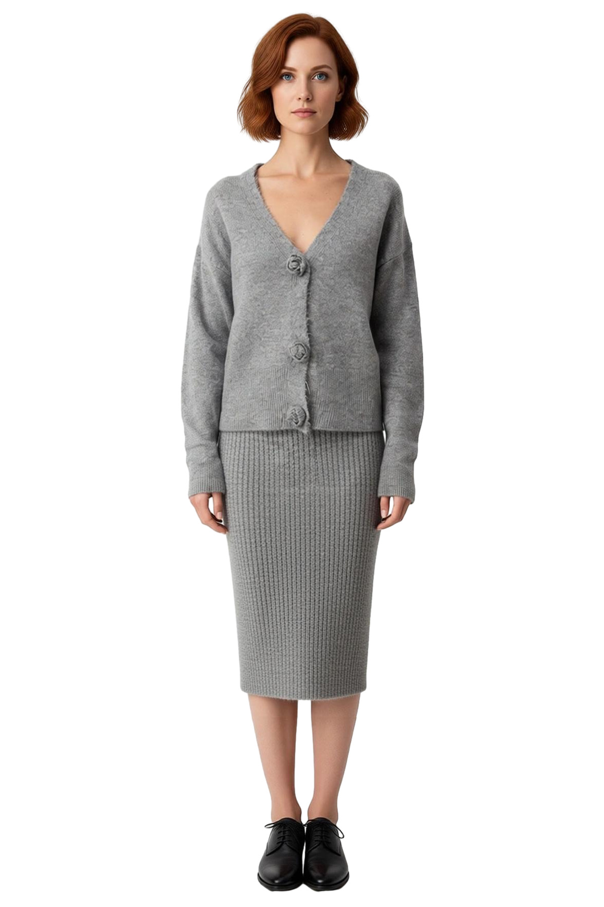 Kadın Vücudu Saran Midi Etek ve Düz Desen Standart Kol V Yaka Triko Hırka İkili Set Kaliteli - Görsel 2