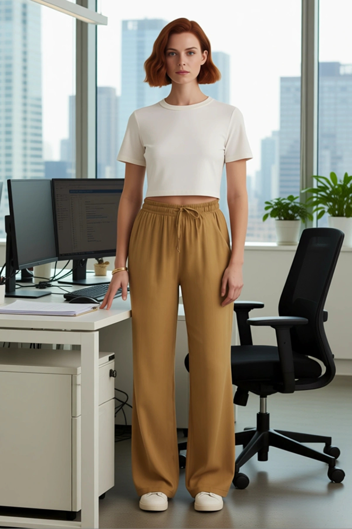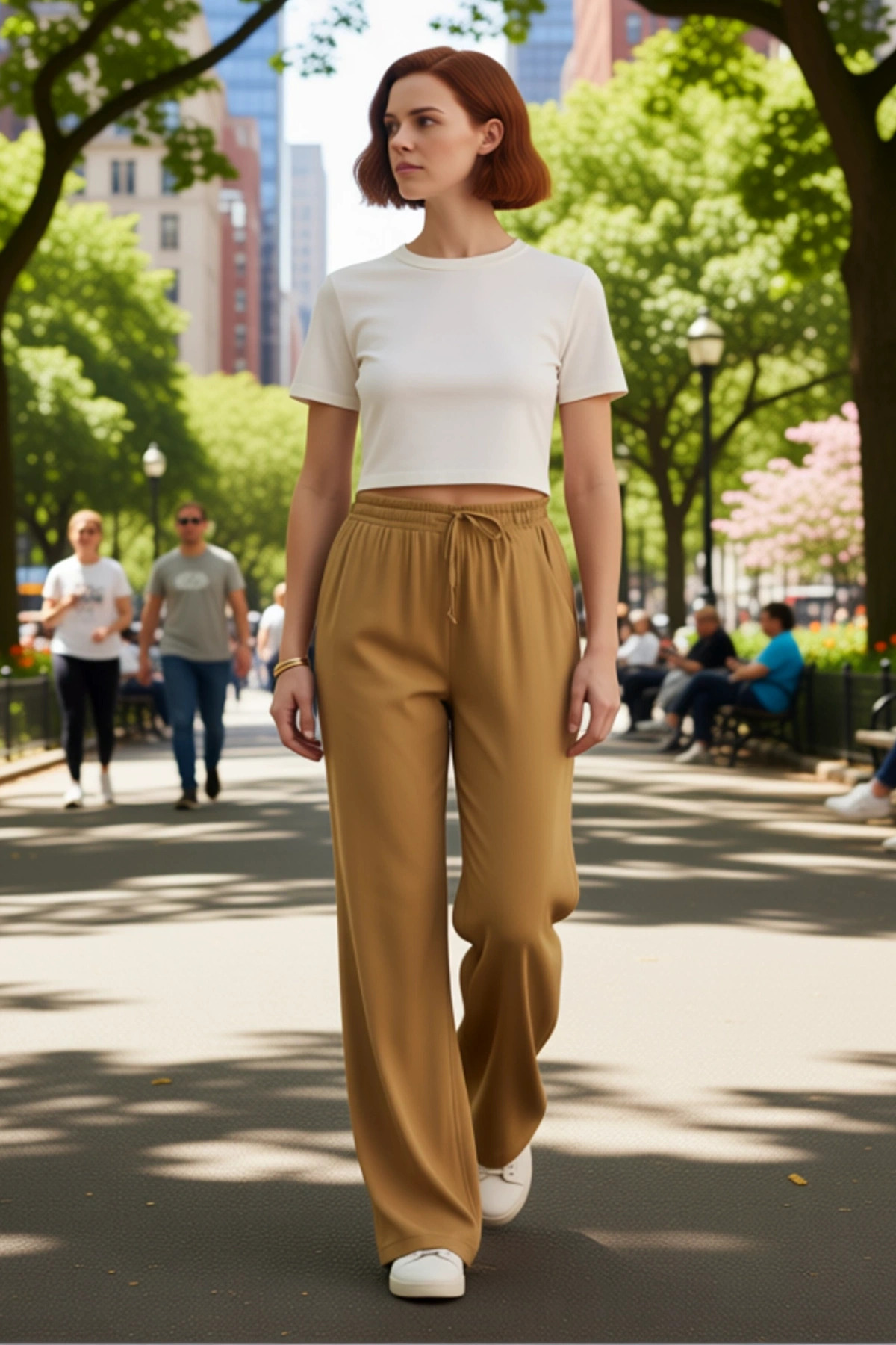 Bu kadın pantolonu, şık ve rahat bir görünüm arayanlar için tasarlanmıştır. %75 pamuk ve %25 keten karışımından oluşan dokuma kumaşı, hem yumuşaklığı hem de nefes alabilirliği ile öne çıkar. Jakarlı deseni, pantolona zarif bir doku katarken, düz rengi sayesinde farklı üstlerle kolayca uyum sağlar. Wide leg ve geniş paça kesimi, modern bir silüet oluştururken, hareket özgürlüğünü de maksimize eder. Yüksek bel ve beli lastikli tasarımı, konforlu bir kullanım sunar ve vücuda hoş bir şekilde oturur. Bu pantolon, casual ve günlük koleksiyonun bir parçası olarak, cool ve konfor odaklı bir stil anlayışını benimseyen kadınlar için idealdir. Regular boyu ve geniş paça özelliği, her vücut tipine uyum sağlayarak şık bir görünüm sunar. Bu ürün, hem şıklığı hem de rahatlığı bir arada arayanların gardıroplarında mutlaka bulunması gereken bir parçadır. Pantolonun wide leg ve geniş paça kesimi, gün boyu süren bir konfor sunar. Bu kesim, bacakları daha uzun ve ince gösterme eğilimindedir. Yüksek bel detayı, vücut hatlarını belirginleştirerek daha estetik bir görünüm sağlar. Beldeki lastik ve ayarlanabilir ip, pantolonun beden uyumunu kişiselleştirme imkanı sunar. Dokuma kumaşın jakarlı deseni, pantolona sofistike bir hava katarak onu sıradanlıktan uzaklaştırır. Keten karışımlı pamuklu materyali, cilde dost ve nefes alabilen bir yapıya sahiptir, bu da özellikle sıcak havalarda tercih edilmesini sağlar. Bu pantolon, hem günlük hayatta hem de özel günlerde rahatlıkla kullanılabilecek çok yönlü bir parçadır. Bu pantolon, ilkbahar ve yaz ayları için mükemmel bir seçenektir. Hafif yapısı ve nefes alabilen kumaşı sayesinde serin tutar. Kombin önerisi olarak, basic bir tişört, crop top veya şık bir bluz ile tamamlanabilir. Altına giyilecek beyaz spor ayakkabılar, espadriller veya şık sandaletler ile rahat bir günlük stil oluşturulabilir. Daha sofistike bir görünüm için, topuklu ayakkabılar ve zarif bir gömlek ile kombinlenebilir. Pantolonun bakımı için, ürün etiketindeki talimatlara uyulması önerilir. Genellikle düşük sıcaklıkta elde yıkama veya hassas yıkama programı tercih edilmelidir.