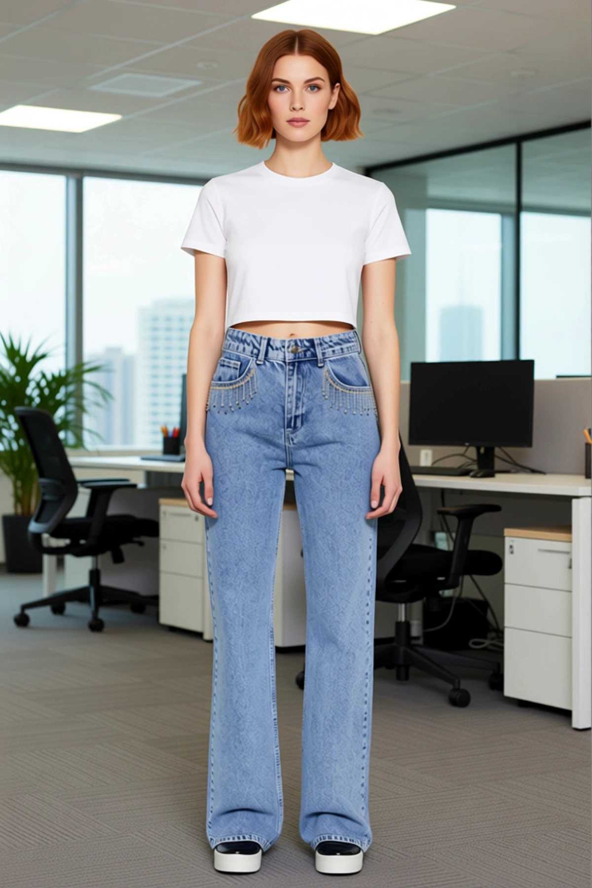 Bu şık kadın jean pantolon, modern ve dikkat çekici tasarımıyla gardırobunuzun yıldızı olmaya aday. Yüksek bel ve geniş paça (wide leg) kesimi, vücut hatlarını zarifçe vurgulayarak hem rahat hem de stil sahibi bir görünüm sunar. %100 pamuk materyali, kumaşın nefes alabilirliğini ve yumuşaklığını sağlayarak gün boyu üstün bir konfor sunar. Denim kumaşın dayanıklılığı ve kalitesi, bu pantolonu uzun yıllar severek kullanmanızı garantiler. Ürünün en belirgin özelliği, ön ceplerin kenarlarında yer alan zarif ve parlak taş aksesuarlarıdır. Bu detaylar, pantolona sofistike bir dokunuş katarak onu sıradan bir jean’den ayırır. Düz mavi rengi, klasik denim görünümünü korurken, taş detayları ile modern bir yorum katılır. Wide leg silueti, hareket özgürlüğü sunarken aynı zamanda zarif bir duruş sergilemenize olanak tanır. Fermuarlı kapama ve rijit dokuma, pantolonun formunu korumasına ve şıklığını uzun süre muhafaza etmesine yardımcı olur. Bu jean pantolonun yüksek bel tasarımı, bel çizgisini belirginleştirerek daha uzun ve ince bir siluet oluşturur. Geniş paça kesimi ise rahatlığı ön planda tutarken, güncel moda trendlerine uygun bir görünüm sunar. Cep kenarlarındaki taş işlemeleri, pantolona ışıltı ve zarafet katarak gece ve gündüz kullanıma uygun hale getirir. %100 pamuk içeriği, cildinize nazik davranır ve özellikle sıcak günlerde serinlik hissi verir. Fermuarlı ön kısmı, kullanım kolaylığı sağlarken, rijit denim dokusu pantolonun şeklini koruyarak her zaman bakımlı görünmenizi sağlar. Bu pantolon, casual şıklığı ve özgün detayları bir arada arayan kadınlar için ideal bir seçenektir. Bu geniş paça jean pantolon, her mevsim kullanıma uygun bir parçadır. Bahar ve yaz aylarında basic bir tişört veya crop top ile kombinleyerek rahat ve şık bir günlük stil oluşturabilirsiniz. Kış aylarında ise kalın bir kazak veya şık bir gömlek ile tamamlayarak katmanlı bir görünüm elde edebilirsiniz. Pantolonun taş detayları, gece davetleri veya özel etkinlikler için de uygun bir seçenek sunar. Şık bir bluz ve topuklu ayakkabılarla kombinleyerek göz alıcı bir akşam görünümü yaratabilirsiniz. Kombinlerinizi zarif bir çanta ve minimal aksesuarlarla tamamlayarak stilinizi zirveye taşıyın. Ürünün bakımında, renklerin canlılığını korumak için düşük sıcaklıkta ve ters çevrilerek yıkanması önerilir.