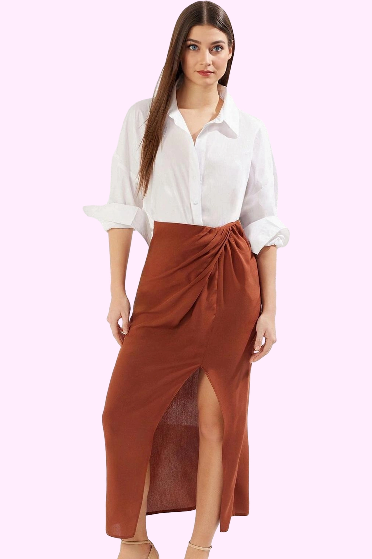 Sizi yazın sıcak günlerinde serin ve şık tutacak bir etek arıyorsanız, doğru yerdesiniz! Bu muhteşem maxi etek, rahatlığı ve şıklığı birleştiren kusursuz bir seçim. Dökümlü, nefes alan dokuma kumaşıyla gün boyu rahatlık sunarken, A-line kesimi her vücut tipine mükemmel uyum sağlar. Öndeki yırtmaç detayı, eteğe hareketlilik ve modern bir hava katıyor. Büzgü detayı ise belinizi ince göstererek silüetinize vurgu yapıyor.