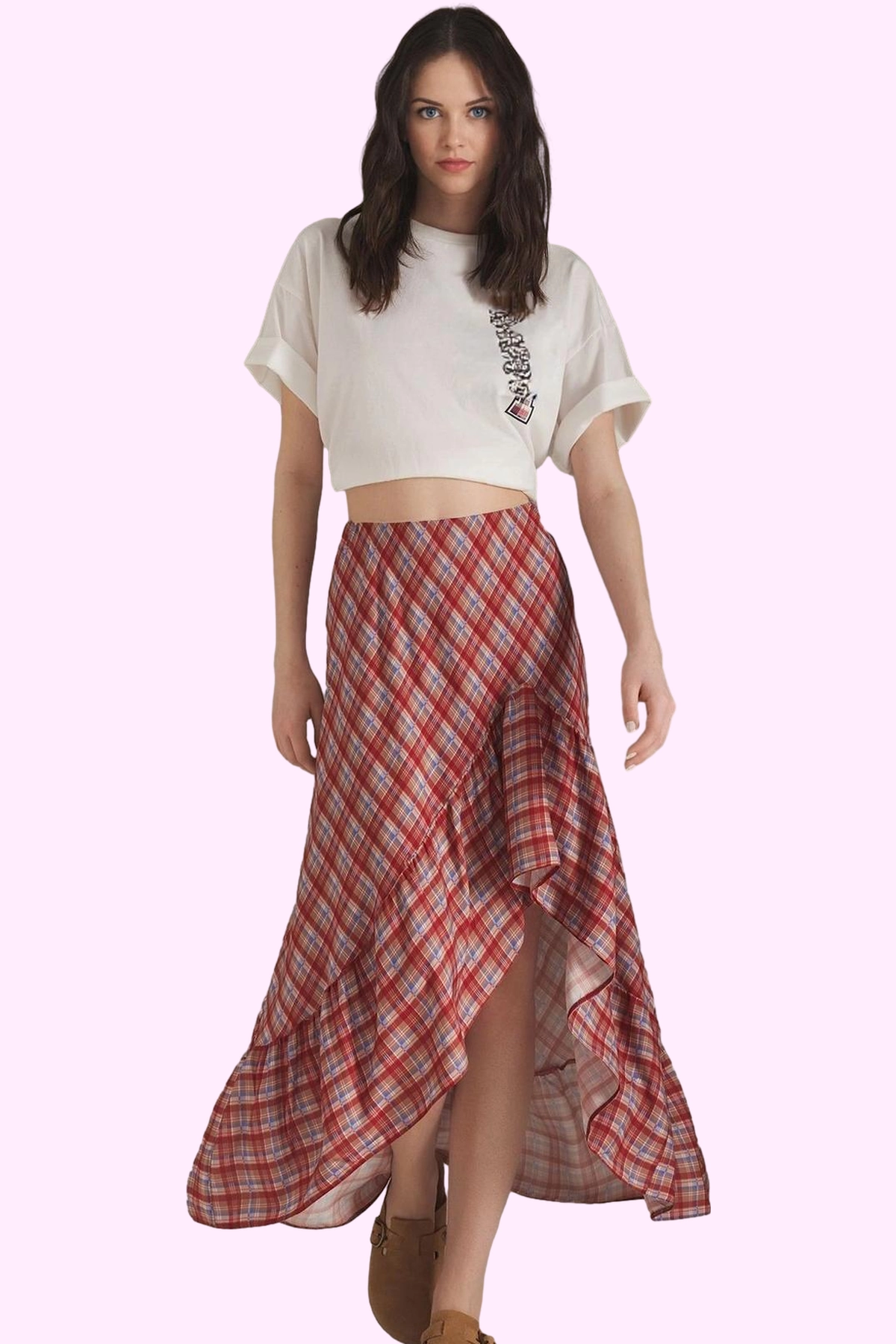 Eteğimizin asimetrik kesimi, her adımınızda zarif bir hareketlilik sunar. Canlı ekose desenleri ise stilinize enerji katacak. Günlük yaşamınızda rahatlıkla kullanabileceğiniz gibi, özel günlerde de şıklığınıza şıklık katacaktır. Midi boy uzunluğu, her vücut tipine uyum sağlar ve farklı kombinler oluşturmanıza imkan tanır. Eteği, düz renkli tişörtler, bluzlar veya ince kazaklarla kombinleyebilirsiniz. Spor ayakkabılarla günlük bir tarz yakalarken, topuklu ayakkabılarla da daha şık bir görünüm elde edebilirsiniz.