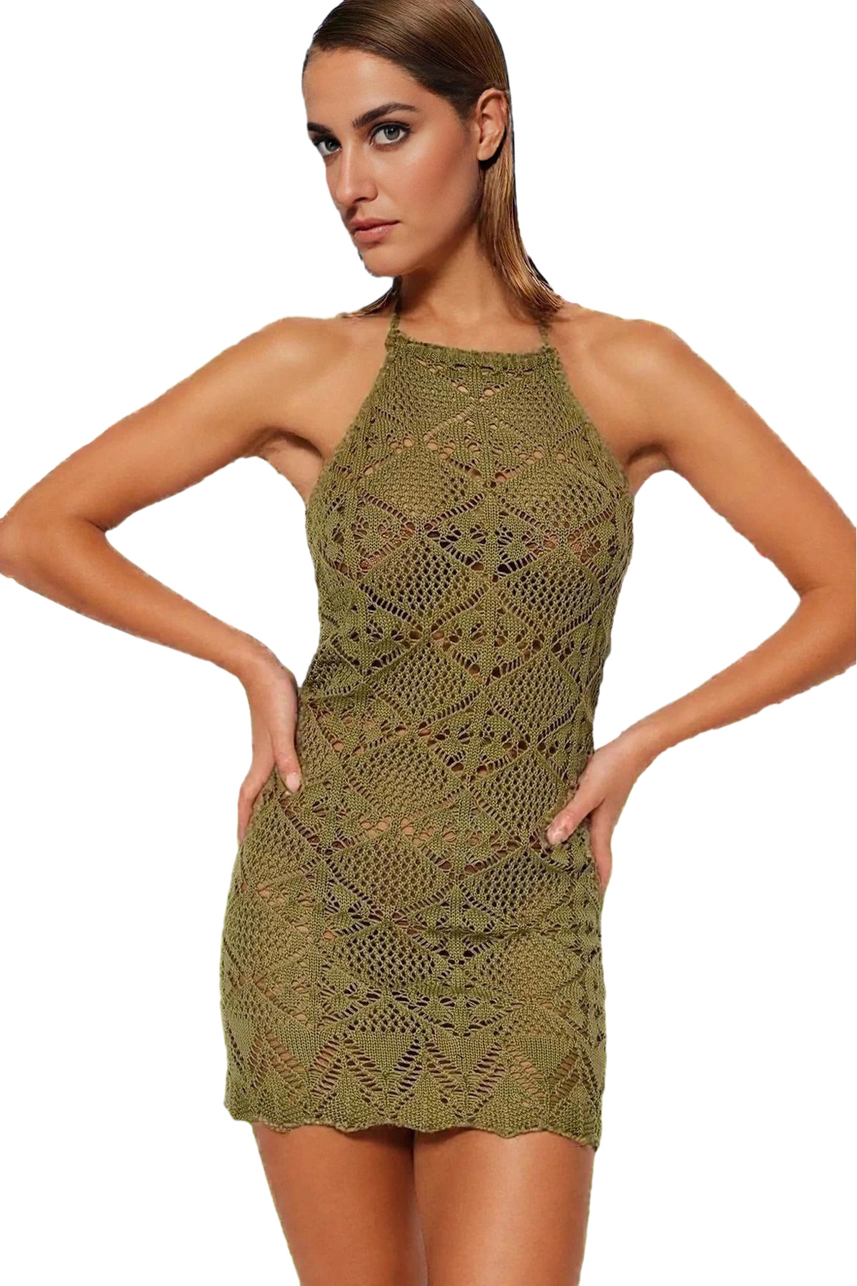 Bu yazın en göz alıcı plaj elbisesi ile tanışın! Vücut hatlarınızı mükemmel bir şekilde ortaya koyan, mini boy ve vücuda oturan tasarımı ile kendinizi özgüvenli ve rahat hissedeceksiniz. İnce örme yapısı, nefes alabilir ve hafif bir yapı sunarken, pamuklu ve akrilik karışımı sayesinde gün boyu konfor sağlar. Halter yakası ve sırt dekoltesi ile şıklığı ve feminenliği bir araya getiren bu elbise, plaj günlerinizin vazgeçilmezi olacak.