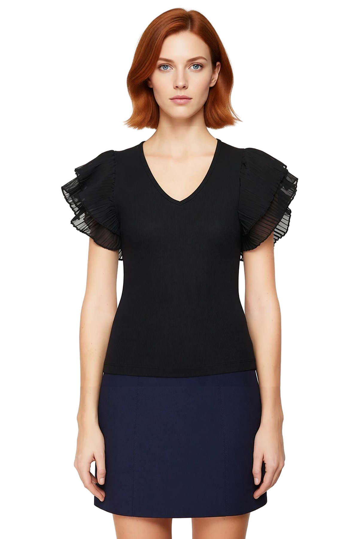 Bu sezonun en trend parçalarından biri olan siyah bluzumuz, şıklığı ve rahatlığı bir araya getiriyor. Vücuda oturan (Fitted) kesimiyle feminen bir görünüm sağlarken, kısa kolları ve V yakasıyla sıcak yaz günlerinde serin kalmanıza yardımcı olur. Polyester karışımlı örme kumaştan üretilen bluz, nefes alabilir yapısıyla gün boyu konfor sunuyor. Tül detaylı katlı kolları ise bluza romantik ve modern bir hava katıyor.