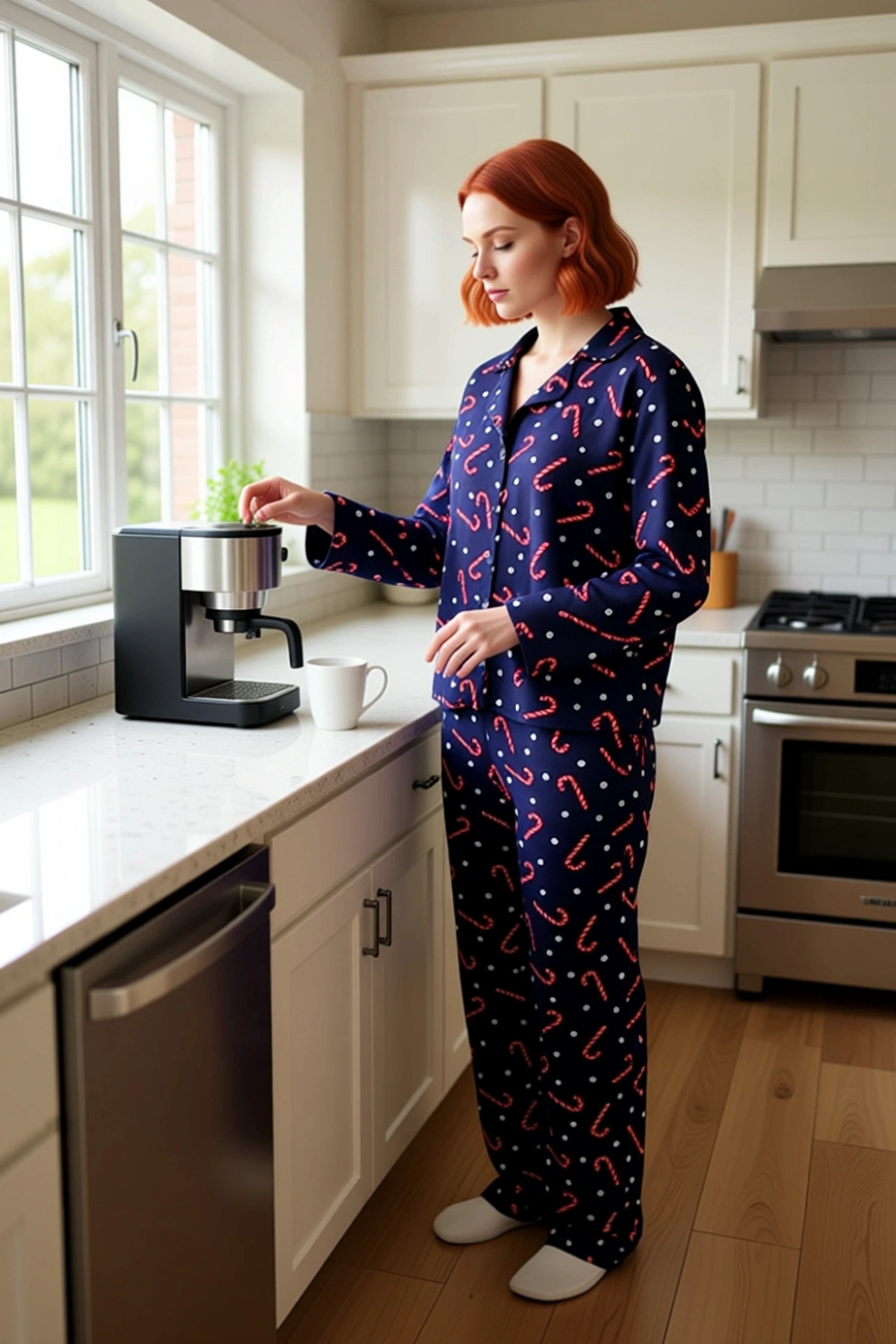 Bu şık kadın pijama takımı, %100 viskon kumaşın sunduğu eşsiz yumuşaklık ve nefes alabilirlik ile tasarlanmıştır. Lacivert zemin üzerine işlenmiş eğlenceli yılbaşı temalı şeker bastonları ve puantiyeler, bu takıma neşeli bir dokunuş katıyor. Düz kesim ve regular kalıp, her vücut tipine uyum sağlayarak rahat bir kullanım sunar. Dokuma kumaşın hafifliği ve metraj baskı tekniğiyle elde edilen canlı desenler, bu pijama takımını hem şık hem de konforlu bir ev giysisi haline getiriyor. Yılbaşı ruhunu evinize taşımak ve kış aylarında sıcak bir atmosfer yaratmak için ideal bir seçimdir. Bu ürün, cool ve konforlu bir stil arayan kadınlar için özel olarak üretilmiştir ve lounge/home ortamları için mükemmeldir. Takımın gömlek yaka ve standart kol detayları, klasik bir görünüm sunarken, düğmeli ön kısmı pratik bir kullanım sağlar. Pantolonların geniş paça kesimi ve normal bel özelliği, hareket özgürlüğünü en üst düzeye çıkarır ve gün boyu süren bir rahatlık sunar. Viskonun ipeksi dokusu, cildinize nazikçe dokunarak maksimum konfor sağlar. Bu pijama takımı, sadece uyku saatlerinizde değil, evde geçirdiğiniz her anı daha keyifli hale getirecektir. Şık ve eğlenceli deseni, ev giyiminize farklı bir boyut katarken, rahat kalıbı sayesinde kendinizi özgür hissedeceksiniz. Bu ürün, evde şıklığından ödün vermek istemeyen kadınlar için tasarlanmıştır. Bu viskon pijama takımı, kış mevsiminde evin içinde rahat ve şık vakit geçirmek için idealdir. Pantolonları, yumuşak ev terlikleri veya kalın çoraplarla tamamlayarak kışın soğuğuna karşı ekstra konfor sağlayabilirsiniz. Üst kısmı, tek başına giyilebileceği gibi, üzerine rahat bir hırka ile de kombinlenebilir. Bu takım, aynı zamanda rahat bir jean pantolon ve spor ayakkabılarla da şehirde casual bir görünüm yakalamak için kullanılabilir. Bakımı için hassas yıkama önerilir, böylece kumaşın kalitesi ve desenlerin canlılığı uzun süre korunur.