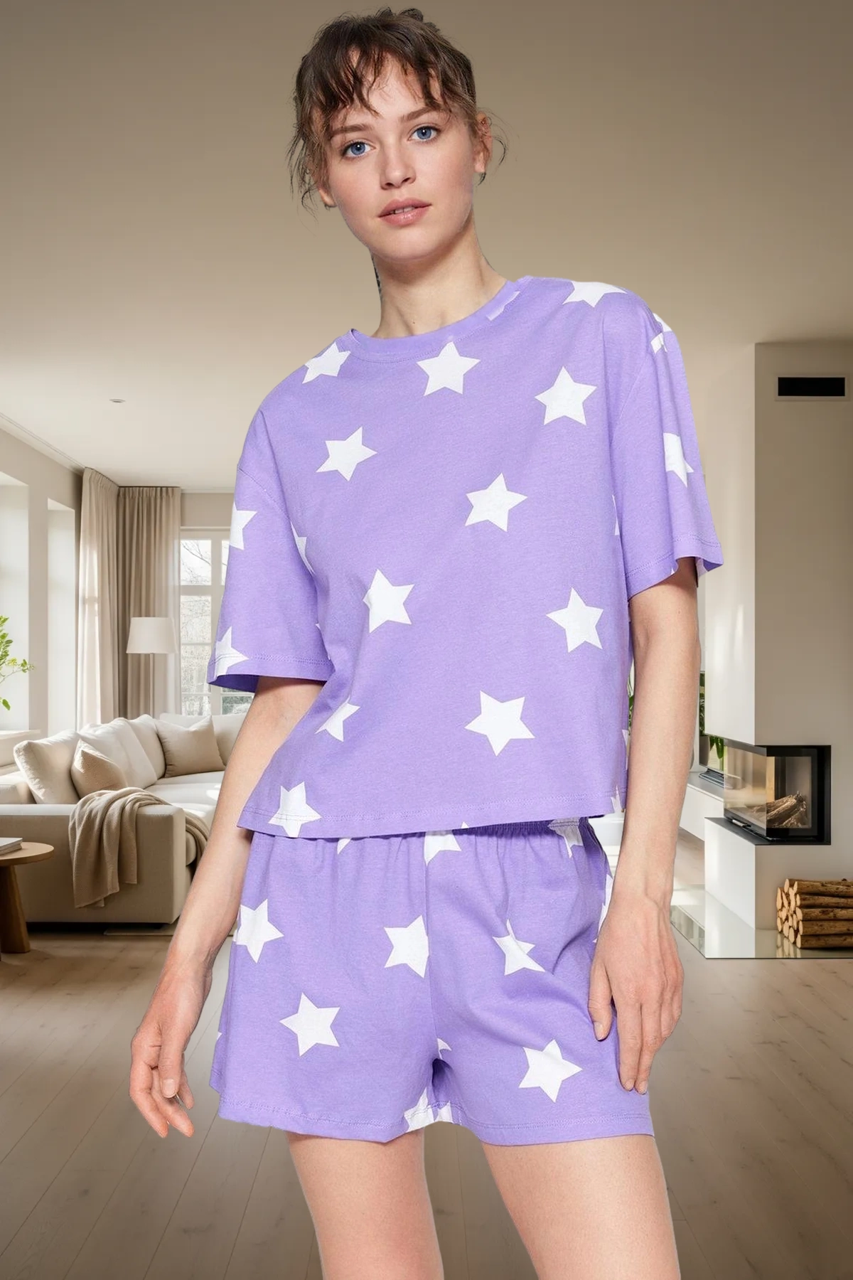 Kadın Yıldız Baskılı Bisiklet Yaka Pijama Takımı Şortlu Fonksiyonel Dayanıklı Kaliteli Şık