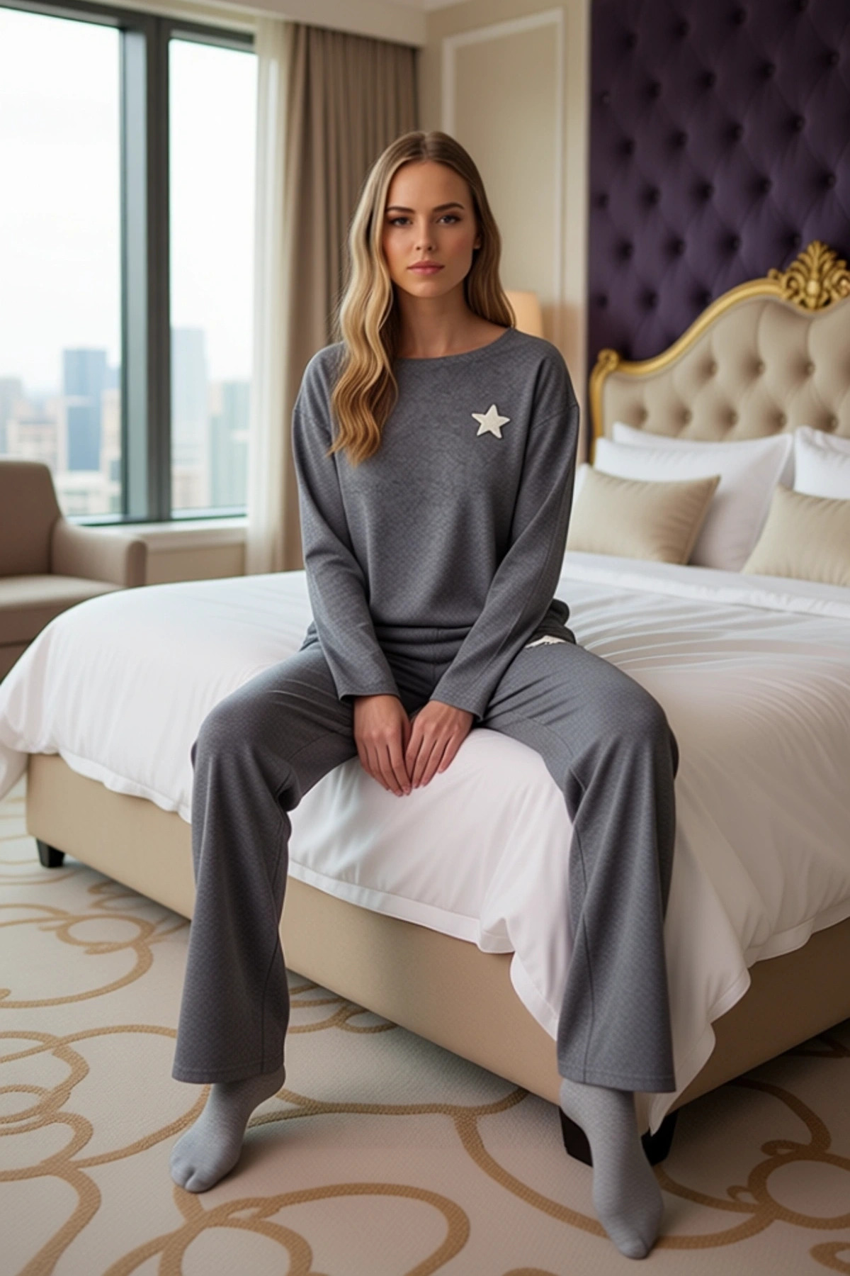 Kadın Yıldız Detaylı Uzun Kollu Pijama Takımı Fonksiyonel Dayanıklı Kaliteli Konforlu Spor
