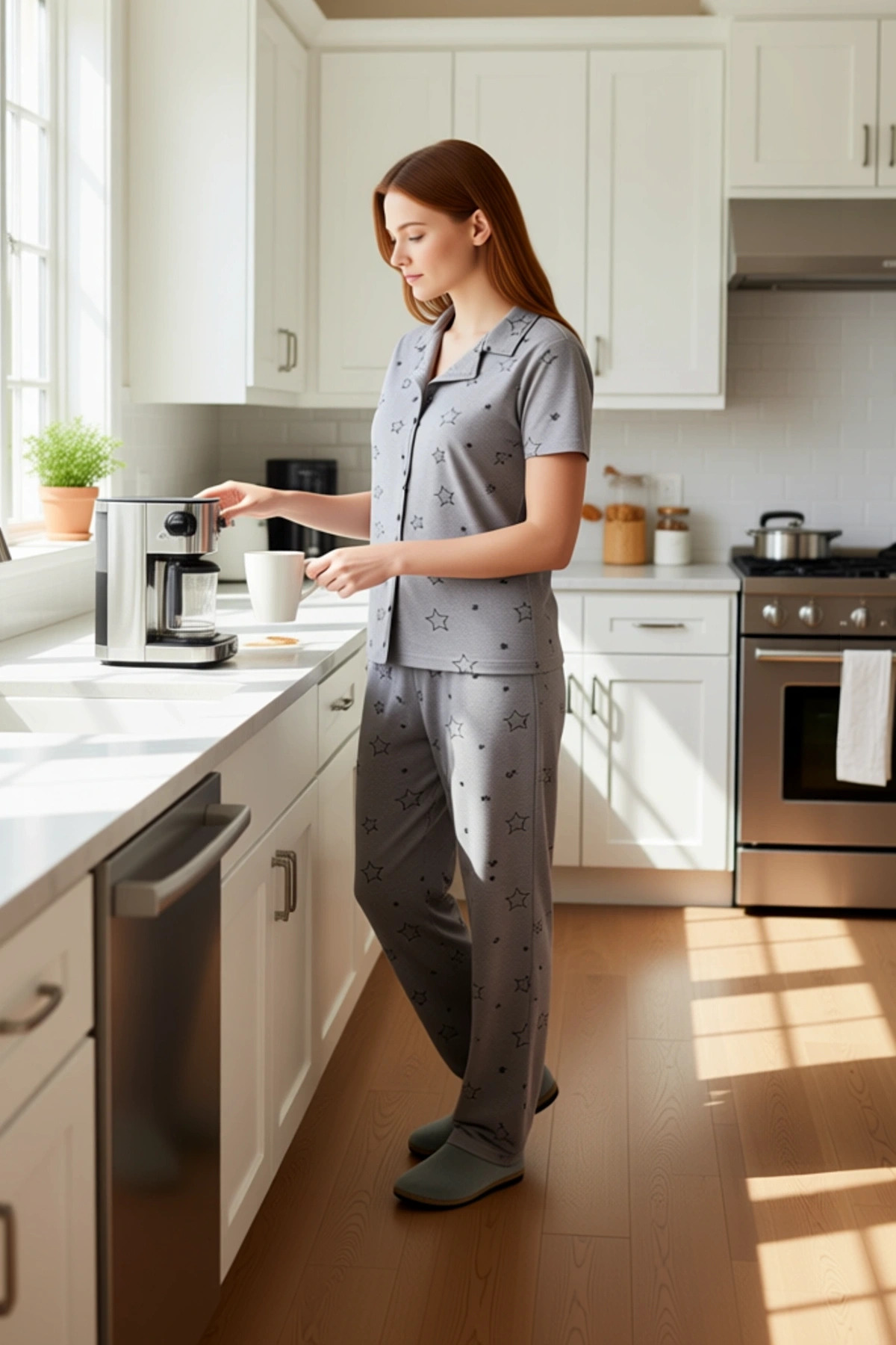 Bu şık ve rahat pijama takımı, kadınlar için özel olarak tasarlanmıştır. Gri melanj rengi ve üzerinde yer alan zarif yıldız deseni, takıma modern bir dokunuş katmaktadır. %60 polyester ve %40 pamuk içeren örme kumaşı, cildinize nazikçe dokunur ve gün boyu süren bir konfor sağlar. Bu karışım, kumaşın nefes alabilirliğini artırırken aynı zamanda dayanıklılığını da ön plana çıkarır. Takımın üstü, klasik bir gömlek yaka tasarımına ve kısa kollara sahiptir, bu da ona hem şık hem de fonksiyonel bir görünüm kazandırır. Alt kısmı ise rahat bir boru paça pantolon olarak tasarlanmıştır. Bu pijama takımı, evde geçirilen zamanı daha keyifli ve konforlu hale getirmek için idealdir. Yıldız deseni, takıma eğlenceli bir hava katarken, genel tasarımın sadeliği onu zamansız kılar. Takımın gömlek yaka detayı, klasik bir görünüm sunarken, kısa kolları sıcak günlerde serinlik sağlar. Regular kesim, vücudu sıkmadan rahat bir oturuş sunar, bu da uyku sırasında veya evde dinlenirken maksimum hareket özgürlüğü sağlar. Pantolonun boru paça kesimi, bacaklarda herhangi bir kısıtlama yaratmaz ve rahat bir kullanım sunar. Örme kumaşın yumuşaklığı, cilde karşı nazik bir his bırakır. Bu pijama takımı, özellikle konforuna önem veren ve aynı zamanda stilinden ödün vermek istemeyen kadınlar için tasarlanmıştır. Cool ve comfort felsefesiyle üretilen bu ürün, ev giyimi için vazgeçilmez bir parça olacaktır. Bu pijama takımı, dört mevsim boyunca rahatlıkla kullanılabilir. İlkbahar ve yaz aylarında serin tutarken, kış aylarında da ev içinde sıcak bir seçenek sunar. Bu takımı, yumuşak ev terlikleri, rahat bir sabahlık veya şık bir ev ayakkabısı ile kombinleyebilirsiniz. Ayrıca, üzerine giyebileceğiniz bir tişört veya sweatshirt ile gündüz ev içinde de rahatlıkla kullanabilirsiniz. Takımın bakımı oldukça pratiktir; makinede yıkanabilir ve düşük sıcaklıkta ütülenebilir, bu da uzun süreli kullanımını garanti eder.