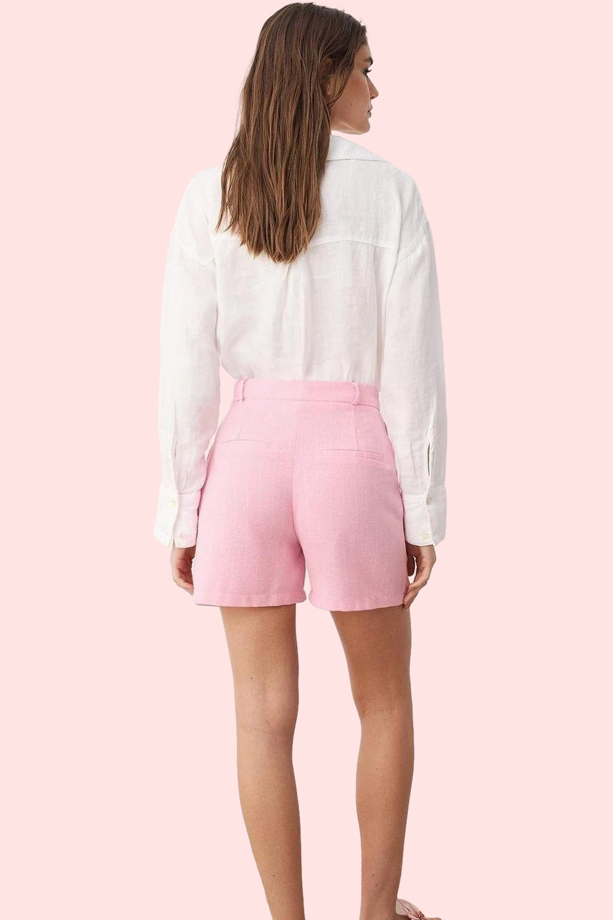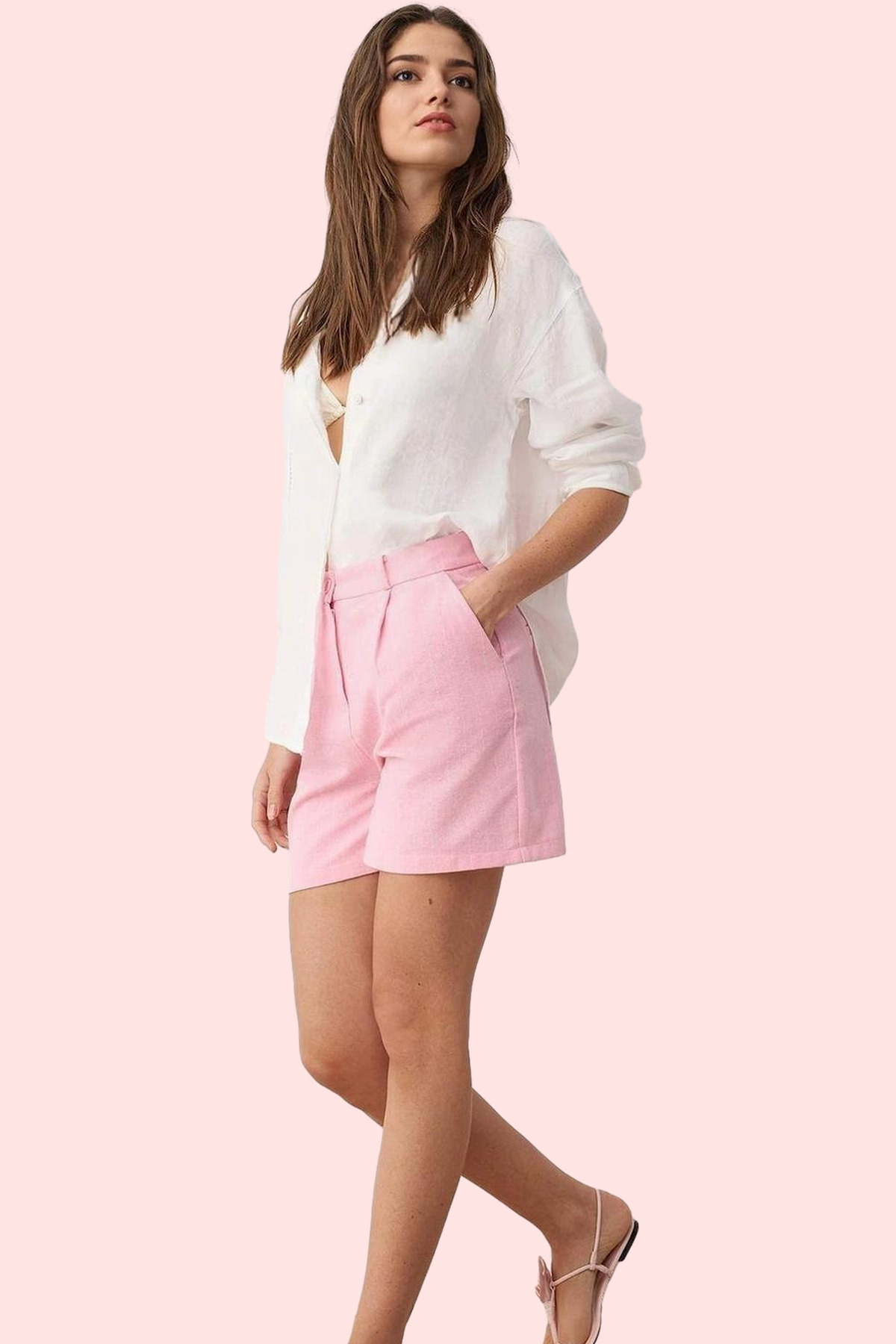 Bu sezonun en trend parçası olan pembe çizgili keten karışımlı şort ile tanışın! Yüksek bel tasarımı ve boru paçası ile kusursuz bir silüet oluştururken, keten karışımı kumaşıyla da gün boyu rahatlık sunuyor. Hafif ve nefes alabilir yapısıyla yaz aylarının sıcak günlerinde bile serin kalmanıza yardımcı olur. Casual tarzınıza mükemmel bir uyum sağlayacak bu şort, günlük kombinlerinizin yeni favorisi olacak.