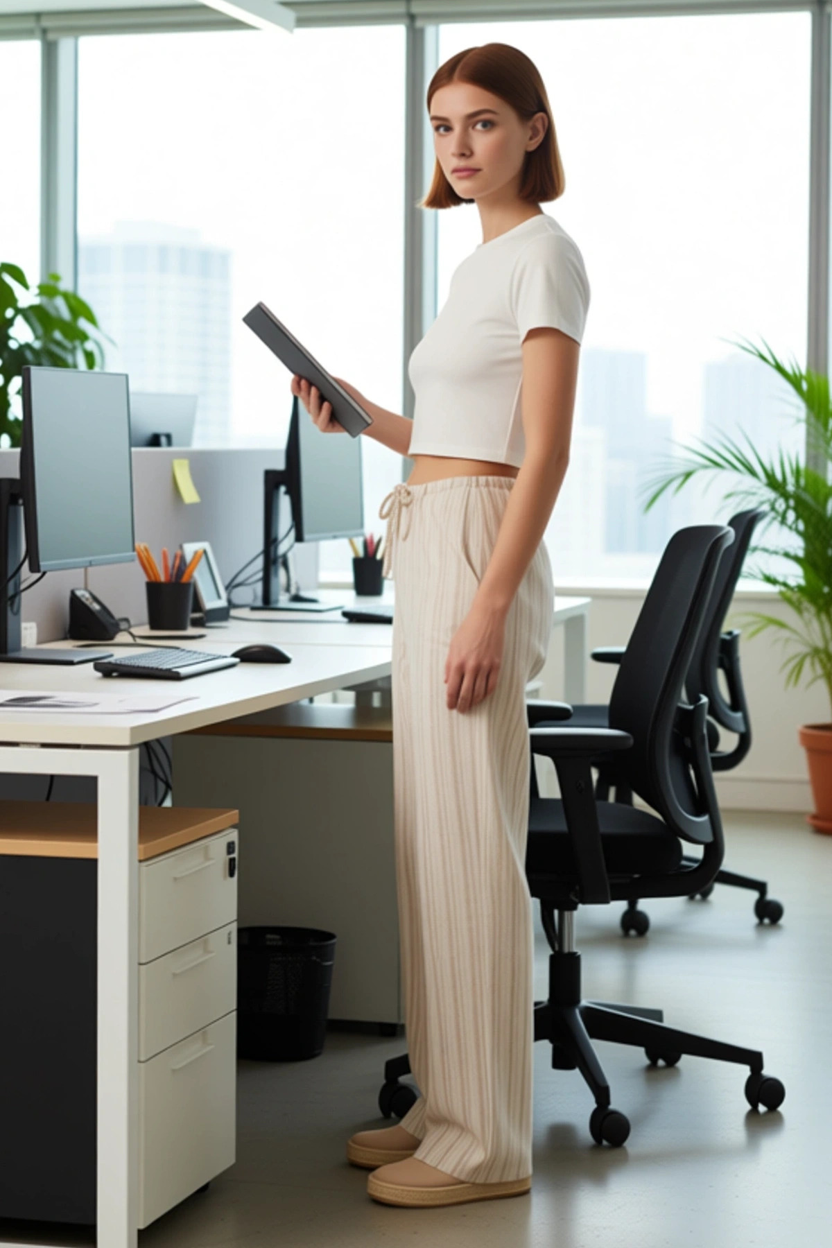 Bu kadın pantolonu, keten görünümlü dokusu ve zarif çizgili deseniyle dikkat çekiyor. %85 pamuk ve %15 polyester karışımı kumaşı, hem yumuşak bir dokunuş hem de uzun ömürlü bir kullanım sunar. Yüksek bel ve geniş paça kesimi, modern ve rahat bir siluet oluşturarak gün boyu konforlu bir deneyim sağlar. Beldeki büzgülü ip detayı, pantolona sportif bir hava katarken, kişisel tercihlere göre ayarlanabilme esnekliği sunar. Çok renkli ince çizgiler, pantolona dinamik bir görünüm kazandırır ve farklı renklerle kolayca kombinlenebilmesine olanak tanır. Casual ve günlük kullanım için ideal olan bu pantolon, hafif yapısıyla sıcak havalarda bile serin kalmanızı sağlar. Bu ürün, rahatlığı ve şıklığı bir arada arayan kadınlar için tasarlanmıştır. Pantolonun yüksek bel tasarımı, vücut hatlarını güzelce vurgularken, geniş paça kesimi hareket özgürlüğünü maksimize eder. Keten görünümlü kumaş, doğal ve hafif bir his verirken, çizgili desen klasik bir şıklık katıyor. Beldeki ayarlanabilir büzgü, hem stilistik bir dokunuş ekler hem de pantolonun beden uyumunu kişiselleştirmenizi sağlar. Bu pantolon, günlük aktivitelerinizde veya hafta sonu gezilerinizde rahatlıkla tercih edebileceğiniz çok yönlü bir parçadır. Yumuşak dokusu ve nefes alabilen yapısı, özellikle yaz aylarında tercih edilmesini sağlar. Şık ve rahat bir görünüm arayan her kadın için ideal bir seçenektir. Bu çizgili geniş paça pantolon, yazlık gardıropların olmazsa olmazıdır. Beyaz bir tişört, basic bir bluz veya keten bir gömlek ile rahatlıkla kombinleyebilirsiniz. Ayakkabı olarak platform sandaletler, düz taban espadriller veya şık terlikler tercih edilebilir. Daha şık bir görünüm için ince topuklu sandaletler de kullanılabilir. Pantolonun rahat kesimi, salaş bir kazak veya sweatshirt ile de uyum sağlayacaktır. Bakımı için renkli giysiler için uygun deterjanlarla, düşük sıcaklıkta yıkama önerilir.