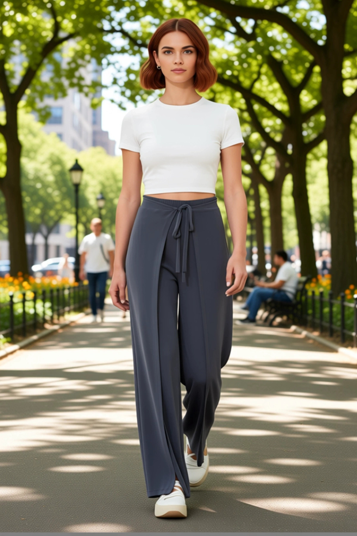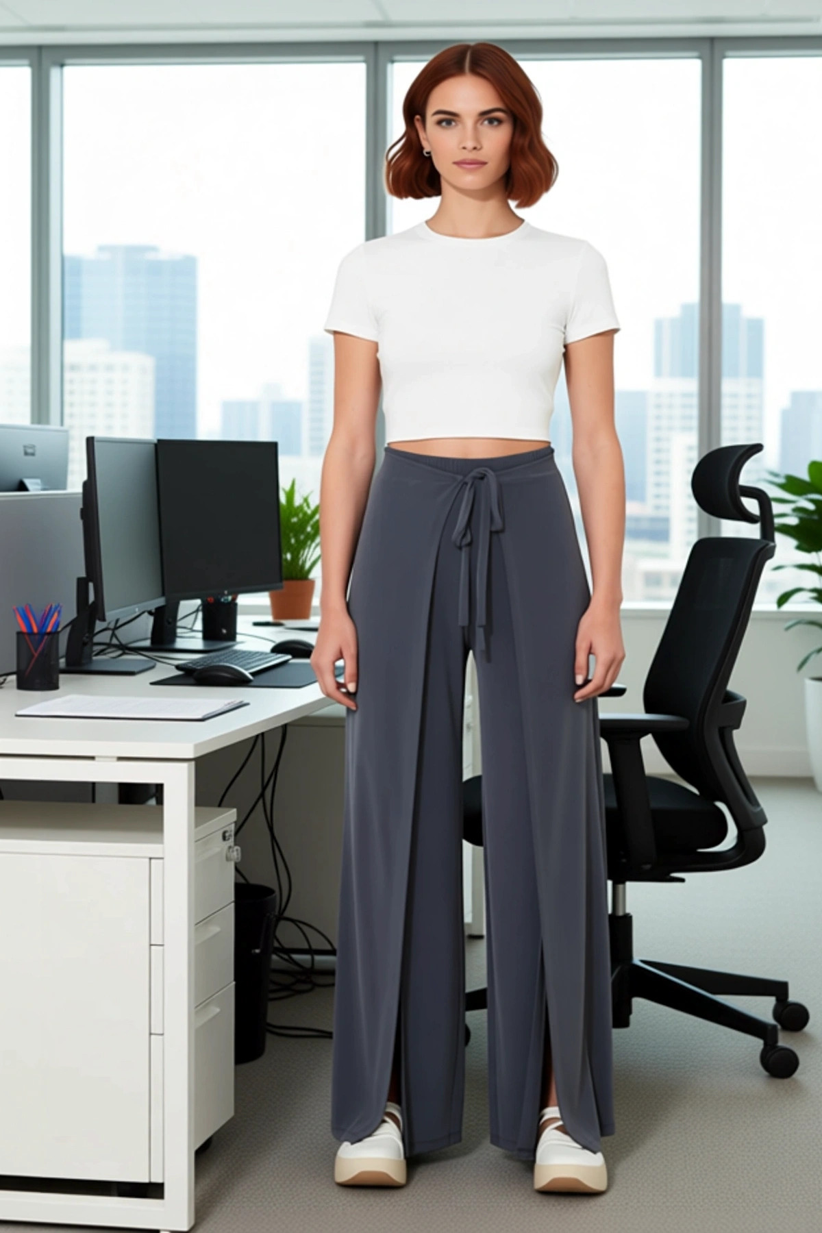 Bu zarif kadın pantolonu, modern tasarımı ve üstün konforu bir araya getirerek stilinize sofistike bir dokunuş katacak. Yüksek bel kesimi, vücut hatlarınızı nazikçe sararak zarif bir siluet oluşturur. Geniş paça modeli, rahatlığı ön planda tutarken aynı zamanda şık bir görünüm sunar. Ön kısmındaki dikkat çekici bağlama detayı, pantolona özgün bir karakter kazandırır ve stilinize kişisel bir dokunuş eklemenize olanak tanır. Yırtmaç detayları, hareket halindeyken dinamik bir görünüm sergiler ve pantolona modern bir hava katar. %96 polyester ve %4 elastan içeren özel kumaş karışımı, pantolonun hem dayanıklı hem de esnek olmasını sağlar, böylece gün boyu rahatlığınızdan ödün vermezsiniz. Düz deseni ve antrasit rengi, bu pantolonu farklı kombinler için ideal bir parça haline getirir. Kalın sandy dokuma kumaş, hem şıklığı hem de dayanıklılığı garanti eder. Bu pantolon, casual ve günlük giyim için tasarlanmıştır ve cool, konforlu bir stil arayan her kadın için biçilmiş kaftandır. Pantolonun geniş paça kesimi, hareket özgürlüğü sunarken aynı zamanda zarif bir akışkanlık sağlar. Yüksek bel detayı, bel çizgisini vurgulayarak daha uzun ve ince bir görünüm elde etmenize yardımcı olur. Ön taraftaki bağlama detayı, pantolona hem stilistik bir öğe ekler hem de bel çevresini ayarlama imkanı sunar. Yırtmaç detayları, pantolonun genel görünümüne modern ve cesur bir yorum katarak sıradanlıktan uzaklaşmasını sağlar. Esnek kumaş yapısı sayesinde, pantolon vücudunuza mükemmel bir şekilde uyum sağlar ve gün boyunca maksimum konfor sunar. Bu pantolon, hem şıklığı hem de rahatlığı bir arada arayan kadınlar için kusursuz bir tercihtir. Günlük kullanımda rahatlığı sağlarken, özel davetlerde de şık bir alternatif olarak öne çıkar. Bu pantolon, özellikle bahar ve yaz ayları için idealdir. Hafif ve nefes alabilen yapısı, sıcak havalarda bile ferah bir kullanım sunar. Bu pantolonu, basic bir tişört, şık bir ipek bluz veya zarif bir gömlek ile tamamlayabilirsiniz. Ayakkabı olarak, platform sandaletler, şık terlikler veya düz taban ayakkabılar ile mükemmel bir uyum yakalayabilirsiniz. Pantolonun geniş paça ve yırtmaç detayları, onu bir etek kadar şık bir alternatif haline getirir. Bakımı oldukça pratiktir; elde veya düşük ısıda makinede yıkanabilir, bu da ürünün ömrünü uzatır.