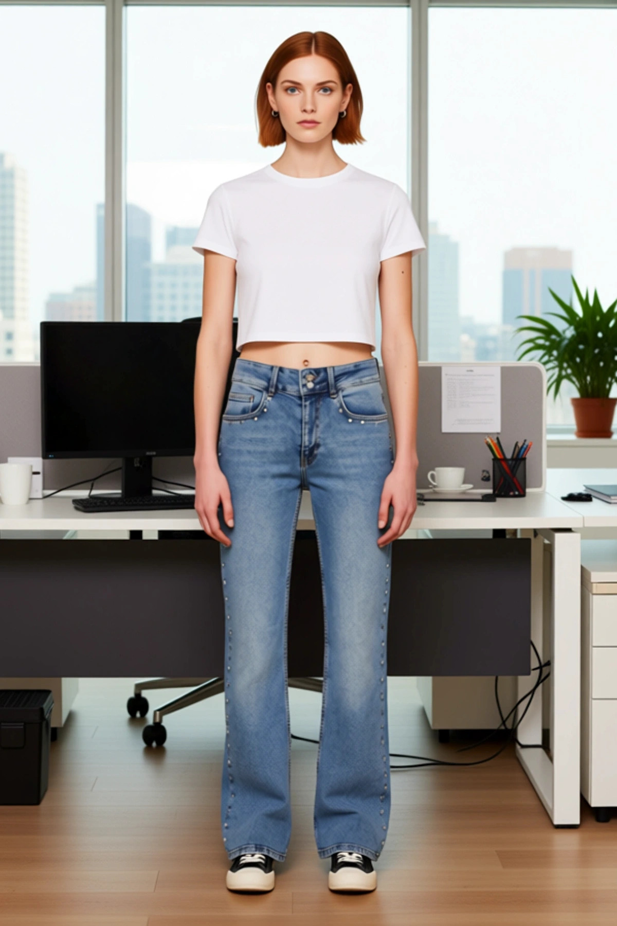 Bu zarif kadın jean pantolon, modern ve feminen bir stil arayanlar için tasarlandı. Yüksek bel kesimi, vücut hatlarını nazikçe sararak kusursuz bir silüet oluşturur. Genişleyen ispanyol paça detayı, pantolona hareketli ve şık bir görünüm kazandırır. Yanlardaki inci benzeri trok süslemeleri, ürüne sofistike bir ışıltı katarak sıradan bir jean’den çok daha fazlasını sunar. Düz deseni ve klasik mavi rengi, bu pantolonu her türlü kıyafetle kolayca uyumlu hale getirir. %99 pamuk ve %1 elastan karışımı, kumaşın hem nefes alabilirliğini hem de esnekliğini artırarak gün boyu maksimum konfor sağlar. Denim kumaşın dayanıklılığı ve comfort dokuma özelliği, bu pantolonu uzun yıllar severek giyebileceğiniz bir parça yapar. Casual ve günlük kullanım için ideal olan bu jean, şıklığı ve rahatlığı bir arada sunar. Pantolonun tasarımında öne çıkan özellikler arasında yüksek bel, genişleyen ispanyol paça ve zarif yan trok detayları bulunur. Yüksek bel, bel bölgesini vurgulayarak daha uzun ve ince bir görünüm sunar. İspanyol paça, pantolona dinamik bir hareketlilik katarken, trok süslemeleri ise ürüne sofistike ve dikkat çekici bir dokunuş ekler. Elastan içeriği sayesinde pantolon, vücudunuza mükemmel bir uyum sağlar ve hareket özgürlüğünüzü kısıtlamadan gün boyu rahatlık sunar. Comfort dokuma denim kumaşı, yumuşak dokusuyla teninize nazikçe temas eder ve kullanım kolaylığı sağlar. Bu jean, hem şık hem de rahat bir görünüm elde etmek isteyen kadınlar için ideal bir seçimdir. Bu jean pantolon, dört mevsim boyunca rahatlıkla kullanılabilir. İlkbahar ve yaz aylarında basic tişörtler, şık bluzlar veya hafif gömleklerle kombinleyebilirsiniz. Sonbahar ve kış aylarında ise triko kazaklar, sweatshirtler veya blazer ceketlerle tamamlayarak şık ve sıcak bir stil oluşturabilirsiniz. Spor ayakkabı, bot veya topuklu ayakkabılarla farklı görünümler elde edebilirsiniz. Bu çok yönlü pantolon, hem günlük kullanımda hem de özel günlerde şıklığınızı tamamlayacaktır. Bakımı kolaydır, makinede yıkanabilir ve düşük ısıda ütülenebilir.