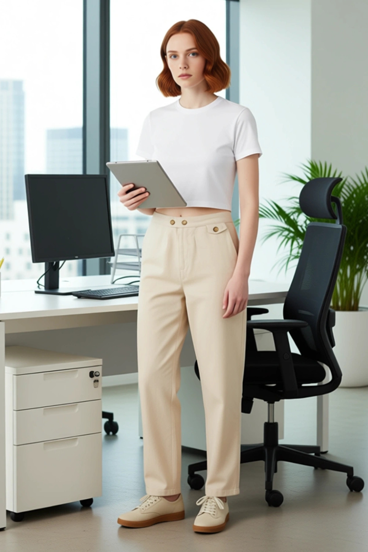 Bu bej renkli kadın pantolonu, %100 keten materyali ile yaz aylarında serin ve rahat bir kullanım sunar. Geniş paça kesimi ve yüksek bel tasarımı, modern ve şık bir siluet oluşturur. Düz deseni ve rijit dokuma tipi, pantolona sofistike bir görünüm kazandırır. Günlük kullanım için tasarlanmış bu pantolon, moda bilincine sahip kadınlar için gardıroplarının vazgeçilmez bir parçası olacaktır. Ketenin doğal dokusu, cilde dostu yapısı ve nefes alabilirliği sayesinde gün boyu konfor sağlar. Bu pantolon, hem rahatlığı hem de stil sahibi bir görünümü bir araya getirenler için mükemmel bir seçenektir. Pantolonun dikkat çekici özellikleri arasında, yüksek bel kesimi, genişleyen paçaları ve zarif kemer detayı yer alır. Bu unsurlar, pantolona hem çağdaş hem de zamansız bir estetik katmaktadır. Ketenin doğal dokusu, gün boyu süren bir rahatlık sağlarken, rijit dokuma tekniği pantolonun şeklini korumasına olanak tanır. Pantolonun kesimi, farklı vücut tiplerine uyum sağlayacak şekilde özenle tasarlanmıştır. Gündelik kullanımından özel etkinliklere kadar her durumda rahatlıkla giyilebilir. Yüksek bel ve geniş paça kombinasyonu, zarif bir görünüm yaratarak stilinize sofistike bir dokunuş ekler. Yaz mevsimi için ideal olan bu pantolon, keten kumaşının hafifliği sayesinde serinlik hissi verir. Beyaz bir basic tişört, şık bir bluz veya zarif bir gömlek ile kusursuz bir uyum yakalar. Altına espadril, sandalet veya zarif topuklu ayakkabılar tercih edebilirsiniz. Kot ceket veya şık bir blazer ceket ile tamamlayarak farklı bir stil yaratabilirsiniz. Bu pantolon, hem rahatlığa hem de şıklığa önem veren kadınlar için biçilmiş kaftandır. Ketenin doğal dokusu, ona kalıcı bir çekicilik katar.
