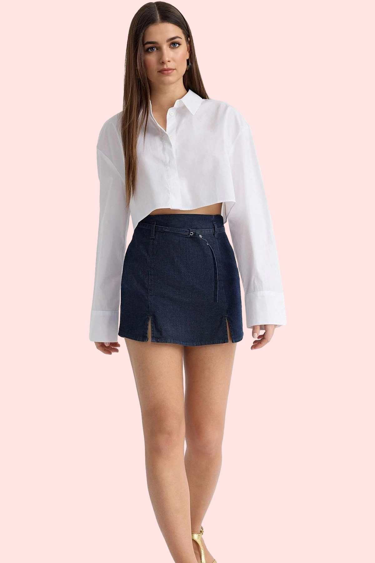 Denim kumaşı, zamansız şıklığını ve dayanıklılığını yansıtır. Yüksek bel kesimi, vücut hatlarınızı kusursuz bir şekilde ortaya koyarken, ince kemeriyle belinizi daha ince gösterir. Kısa boyu sayesinde yaz aylarında serin ve havadar kalırsınız. Yırtmaç detayı ise eteğe modern ve şık bir görünüm kazandırır. Tüm sezonlar boyunca kombinlerinizi tamamlayacak, her zaman şık görünmenizi sağlayacak bir parça.