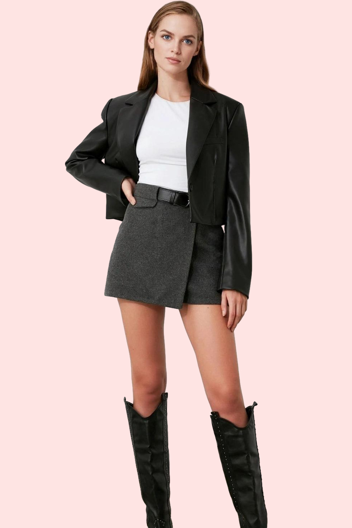 Gri kaşe kumaşı; şıklığı ve sıcak tutan yapısıyla dikkat çeker. Yüksek bel ve kemerli detaylar, belinizi ince gösterirken, şort etek modeliyle rahat bir hareket alanı sunar. Kısa boyu, bacak boyunuzu daha uzun gösterirken, düz desen ve cepsiz tasarımıyla minimal ve zarif bir stil ortaya çıkarır. Rahatlığı ve şıklığı bir arada sunan bu şort etek, her mevsim kullanabileceğiniz bir parça.