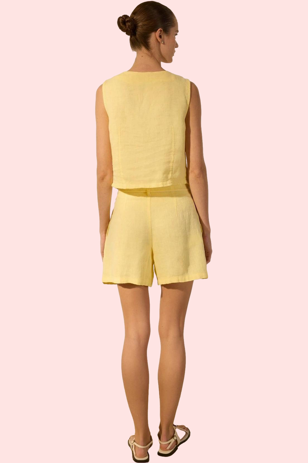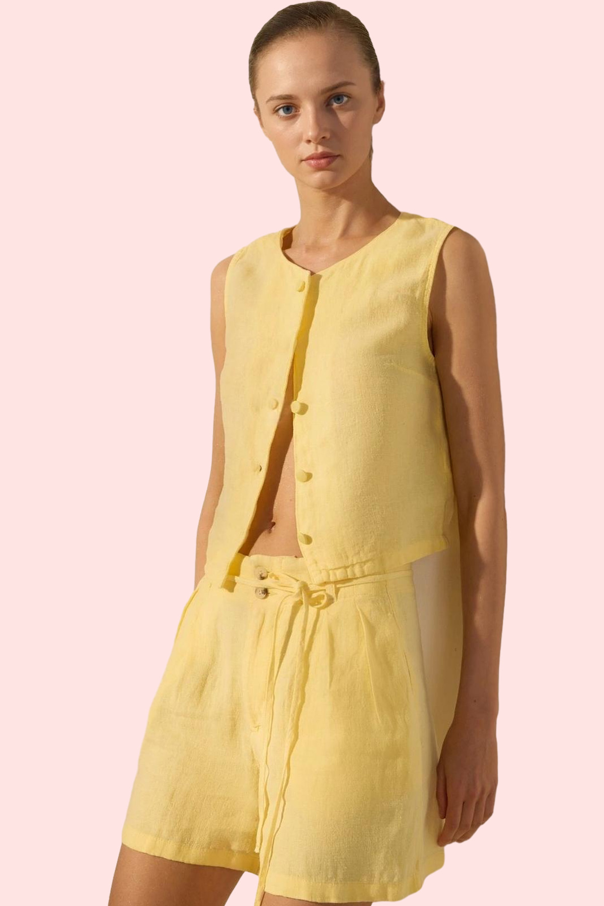 Sıcak yaz günlerinde hem şık hem de rahat olmak mı istiyorsunuz? O zaman bu sarı keten mini şort tam size göre! Yüksek bel tasarımı ve geniş paçası ile son derece rahat ve şık bir görünüm sunuyor. %100 keten kumaşından üretilen şort, nefes alabilir özelliği sayesinde gün boyu ferahlık sağlar. Rigid dokuma tipi ise şortun formunu ve kalitesini uzun süre korumasını garanti eder. Beli bağlama detayı, şorta şık bir dokunuş katarken, kısa boyu da hareket özgürlüğünüzü kısıtlamaz.