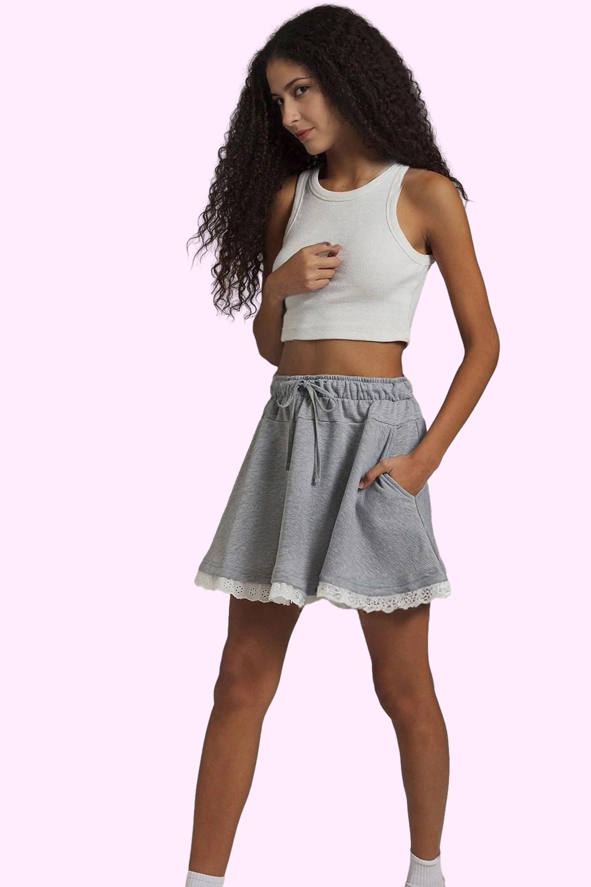 Bu sezonun trendlerinden olan gri mini etek, günlük stilinizi tamamlayacak mükemmel bir seçenek. Yüksek bel tasarımı ve skater kalıbıyla rahatlık ve şıklığı bir arada sunuyor. Nefes alan ve yumuşak örme kumaş, gün boyu konfor sağlar. Eteğin alt kısmındaki dantel detayı, zarif ve feminen bir dokunuş katıyor.