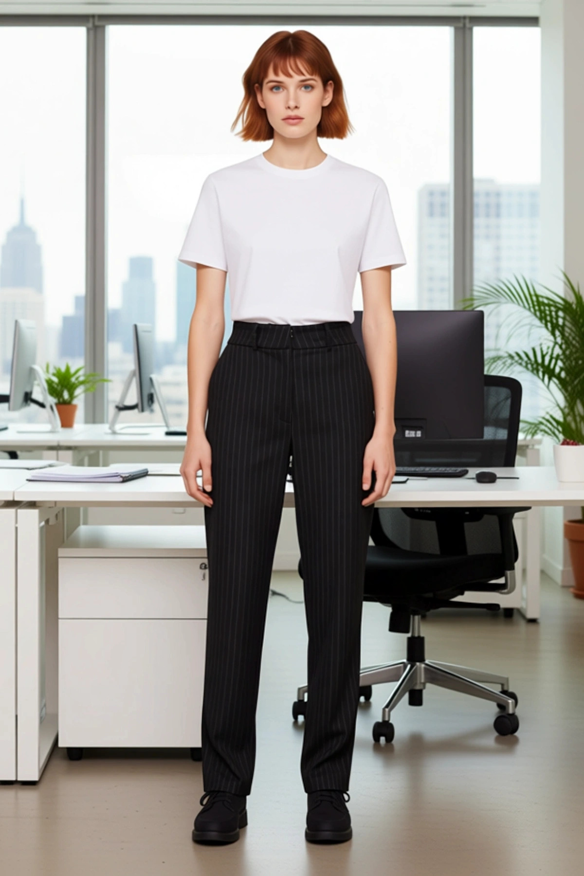 Bu kadın pantolonu, klasik ve zamansız bir görünüm sunan siyah zemin üzerine ince beyaz çizgileriyle öne çıkıyor. Yüksek bel tasarımı, modern bir estetik katarken, straight (düz) paça kesimi rahat bir kullanım sağlıyor. %100 pamuk interlok örme kumaştan üretilmiş olması, yumuşak dokusu ve nefes alabilirliği ile gün boyu üstün konfor sunar. Pantolonun üzerindeki ince çizgiler, klasik bir görünüm kazandırırken, hafif çiçekli desen detayı ona sofistike bir hava katıyor. Bu pantolon, hem günlük şıklığınızı tamamlamak hem de daha resmi ortamlarda zarif bir duruş sergilemek için ideal bir seçenektir. Cep detayları, fonksiyonelliği artırırken, genel tasarımıyla her gardıropta olması gereken bir parça olarak öne çıkıyor. Bu pantolon, akıllı ve zarif bir stil arayan her kadın için mükemmel bir tercihtir. Pantolonun yüksek bel özelliği, vücut hatlarını güzelce vurgulayarak daha uzun ve ince bir görünüm sağlar. Straight kesim paçalar, hareket özgürlüğünü kısıtlamadan rahat bir kullanım sunar. Yaka veya kol detayı bulunmamakla birlikte, bel kısmındaki özenli işçilik ve fermuar detayı pantolonun şık duruşunu destekler. İnterlok örme kumaşın esnek yapısı, gün boyu hareket ederken size maksimum konforu sunar. Bu pantolon, hem şık hem de rahat bir giyim deneyimi arayan kadınlar için tasarlanmıştır. Günlük kullanım için ideal olan bu pantolon, smart persona ile uyumlu bir şekilde hem iş hayatında hem de sosyal etkinliklerde rahatlıkla tercih edilebilir. Cep detayları, pratik bir kullanım sunar. Bu pantolon, özellikle ilkbahar ve sonbahar mevsimlerinde kullanıma uygundur. %100 pamuk interlok örme kumaşı, hem serin hem de sıcak havalarda rahatlık sağlar. Pantolonu, basic bir beyaz tişört ve loafer ayakkabılarla kombinleyerek şık bir ofis görünümü elde edebilirsiniz. Daha rahat bir stil için ise salaş bir kazak ve sneakerlarla tamamlayabilirsiniz. Pantolonun bakımı oldukça basittir; nazikçe yıkayarak ve düşük ısıda ütüleyerek uzun ömürlü kullanımını sağlayabilirsiniz.