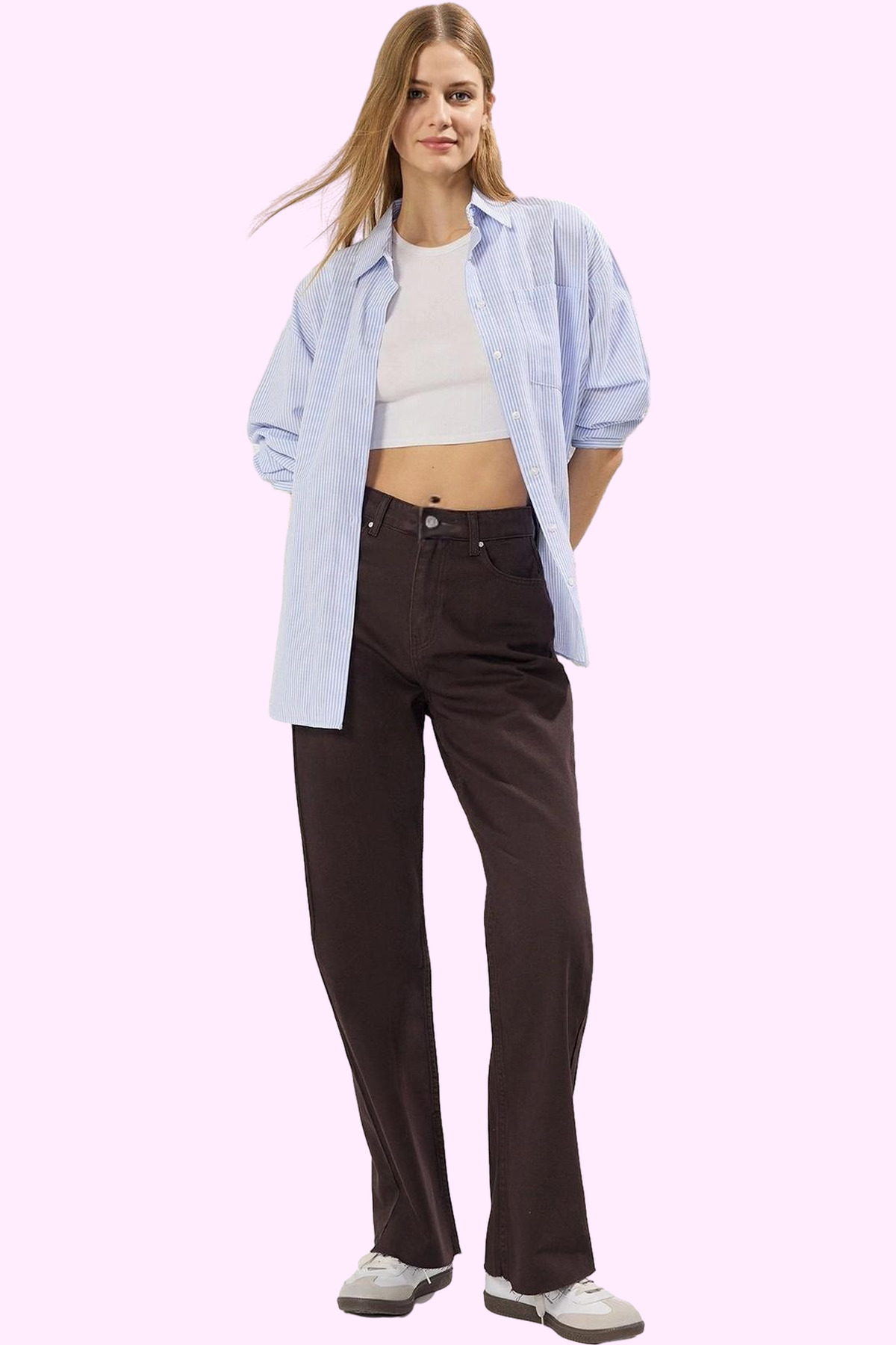 Bu ekru renkli, yüksek bel straight kesim denim pantolon, kadınların gardıropları için zamansız bir parça sunuyor. %100 pamuktan üretilmiş olması, gün boyu süren bir konfor ve nefes alabilirlik sağlıyor. Düz deseni ve klasik denim dokusu, pantolona modern bir dokunuş katarken, geniş paça detayı güncel modayı yansıtıyor. Casual ve günlük kullanım için ideal olan bu pantolon, rahatlığı ve şıklığı bir arada arayan kadınlar için tasarlandı. Yüksek bel özelliği, vücut formunu daha belirgin hale getirirken, straight kesim bacaklara zarif bir görünüm kazandırıyor. Bu pantolon, her zevke hitap eden, kolay kombinlenebilir bir parçadır. Bu pantolonun öne çıkan özellikleri arasında yüksek bel detayı yer alıyor; bu sayede hem daha şık bir duruş sergileniyor hem de bel bölgesi daha ince görünüyor. Straight kesim, bacakları olduğundan daha uzun ve ince gösterme eğilimindedir. Geniş paça ise, rahat bir kullanım sunarken aynı zamanda stil sahibi bir görünüm katıyor. %100 pamuk kumaşı, cildinize dost, yumuşak bir dokunuş sağlıyor ve gün boyu rahat etmenizi garantiliyor. Rigid denim yapısı, pantolonun formunu korumasına yardımcı oluyor ve zamanla daha da kişisel bir hal almasını sağlıyor. Ekru rengi, her türlü renk paletiyle uyum sağlayabilen çok yönlü bir seçenektir. Bu pantolon, hem günlük hayatta hem de daha özel anlarda tercih edilebilecek bir şıklık sunuyor. Bu ekru denim pantolon, dört mevsim boyunca rahatlıkla giyilebilir. İlkbahar ve yaz aylarında basic tişörtler, crop toplar ve spor ayakkabılarla kombinleyerek rahat bir günlük stil oluşturabilirsiniz. Sonbahar ve kış aylarında ise triko kazaklar, sweatshirtler, botlar ve şık bir trençkot ile tamamlayarak daha şık bir görünüm elde edebilirsiniz. Beyaz sneakerlar, loaferlar veya topuklu botlar bu pantolonla harika duracaktır. Kombin önerileri arasında açık renkli bluzlar, kot gömlekler veya oversize sweatshirtler de yer alıyor. Bakımı için makinede yıkanabilir ancak soğuk su ve hassas program tercih edilmelidir. Kurutma makinesi yerine sererek kurutmak kumaşın ömrünü uzatacaktır.