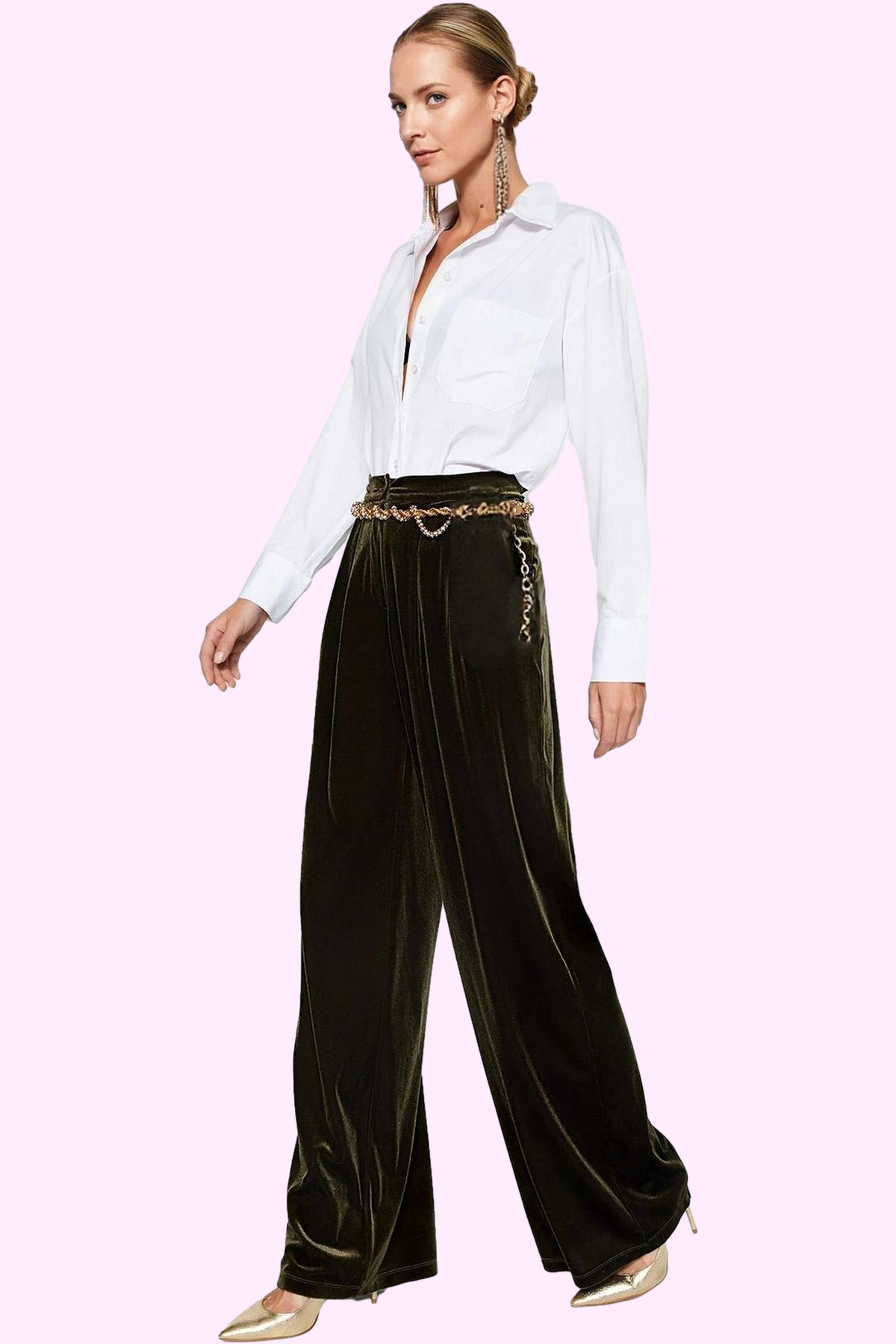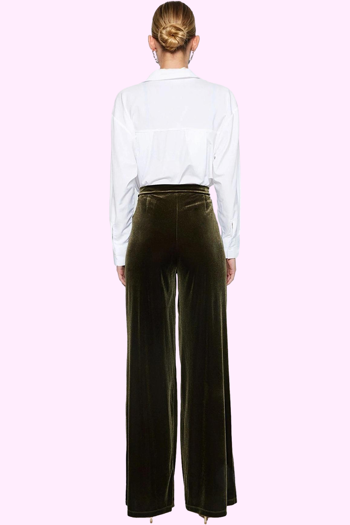 Kumaş Tipi: Örme, Paça Tipi: Geniş Paça, Bel: Yüksek Bel, Kalıp: Wide Leg, Desen: Düz, Renk: Haki, Cep: Çift cepli, Koleksiyon: Şık / Gece, Astar Durumu: Astarsız, Boy: Uzun, Siluet: Wide Leg, Ortam: Şık/Gece, Dokuma Tipi: Kadife, Persona: Fashion Forward, Materyal Bileşeni: 91% Polyester, 9% Elastan, Yıkama Talimatı: T06, Sezon: Kış, Menşei: TR