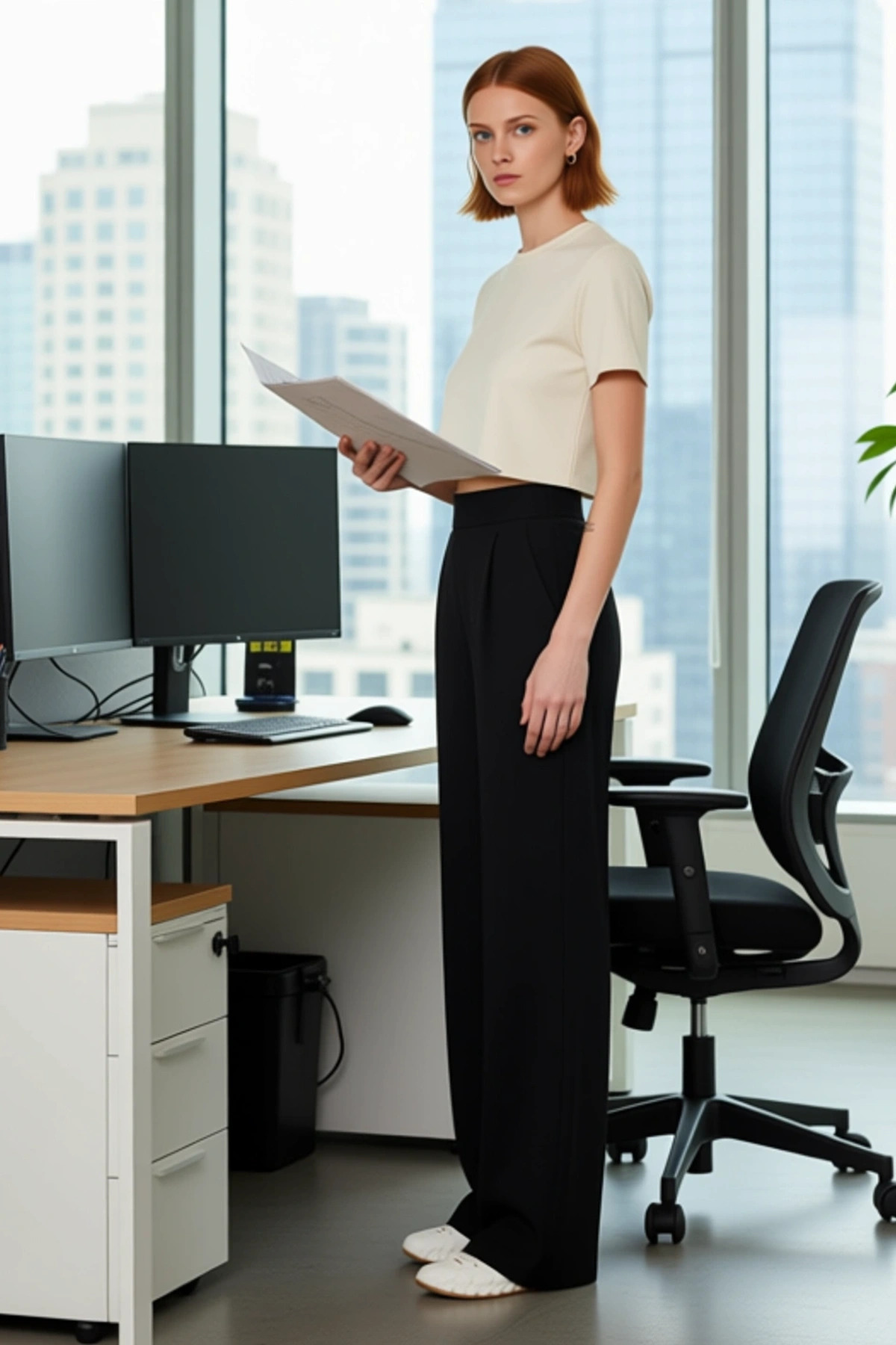 Modern ve şık bir görünüm arayan kadınlar için tasarlanmış bu siyah örme pantolon, gardırobunuzun olmazsa olmazı olacak. Yüksek bel kesimi ve geniş paça (wide leg) kalıbı, zarif bir siluet oluştururken, %97 polyester ve %3 elastan içeriğiyle gün boyu konfor sunar. Düz siyah rengi ve örme dokusu, pantolona hem spor hem de klasik bir hava katıyor. Pileli detayları, hareket özgürlüğü sağlarken şık bir görünüm de sunar. Bu pantolon, casual ve smart koleksiyonlara rahatlıkla uyum sağlayabilir. Günlük kullanımda rahatlığı ön planda tutarken, özel davetlerde de şıklığınızı tamamlayacaktır. Bu pantolon, özellikle vücut tipine göre farklılık gösterebilen geniş paça ve yüksek bel detayları ile dikkat çekiyor. Materyal bileşeni, pantolonun hem esnekliğini hem de dayanıklılığını garanti ediyor, bu da onu uzun ömürlü bir giyim parçası haline getiriyor. Ürün, özellikle örme kumaşın sunduğu nefes alabilirlik ve yumuşak dokusu sayesinde gün boyu rahatlık sunar. Pileli detaylar, pantolona zarif bir hareketlilik kazandırırken, geniş paça tasarımı ise modern ve şık bir duruş sergiler. Bu pantolon, hem gündüz hem de gece kullanıma uygun olup, farklı stil tercihlerine hitap eder. Yüksek bel kesimi, bacak boyunu uzun göstererek zarif bir görünüm sunar. Kadınlar için tasarlanmış bu pantolon, her mevsimde tercih edilebilecek bir parçadır. Beyaz bir basic tişört veya şık bir ipek bluz ile tamamlayarak günlük şıklığınızı yakalayabilirsiniz. Sneakerslarla rahat bir görünüm elde ederken, topuklu sandaletlerle daha sofistike bir stil oluşturabilirsiniz. Pantolon, aynı zamanda zarif bir gömlek ve topuklu ayakkabılarla ofis şıklığı için de idealdir. Bu pantolon, her dolapta bulunması gereken çok yönlü bir parçadır. Bakımı kolaydır ve uzun yıllar boyunca ilk günkü görünümünü korur. Kadınların gardıroplarına modern ve şık bir dokunuş katmak isteyenler için ideal bir seçenektir.