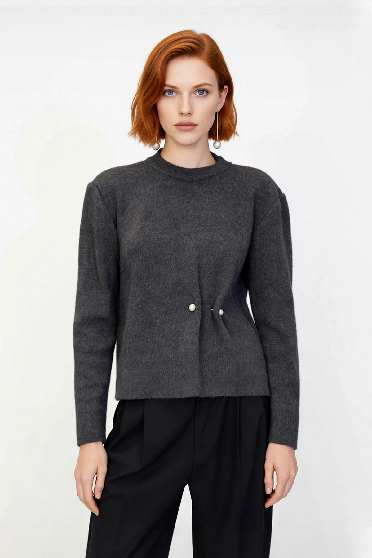 Bu kadın triko kazak, yumuşak dokusuyla gün boyu konfor sunan ve regular kalıbı sayesinde her bedene zarifçe oturan modern bir parçadır. Kaliteli %100 akrilik materyalden üretilmiş olması, soğuk havalarda sizi sıcak tutarken aynı zamanda cildinize hoş bir his bırakır. Düz tasarımı sade ve şık bir zemin oluştururken, bel kısmındaki dikkat çekici inci detayları kazaka özgün ve sofistike bir hava katmaktadır. Bu kazak, fashion forward kadınların gündüzden geceye her anına eşlik edebilecek ideal bir seçenektir.