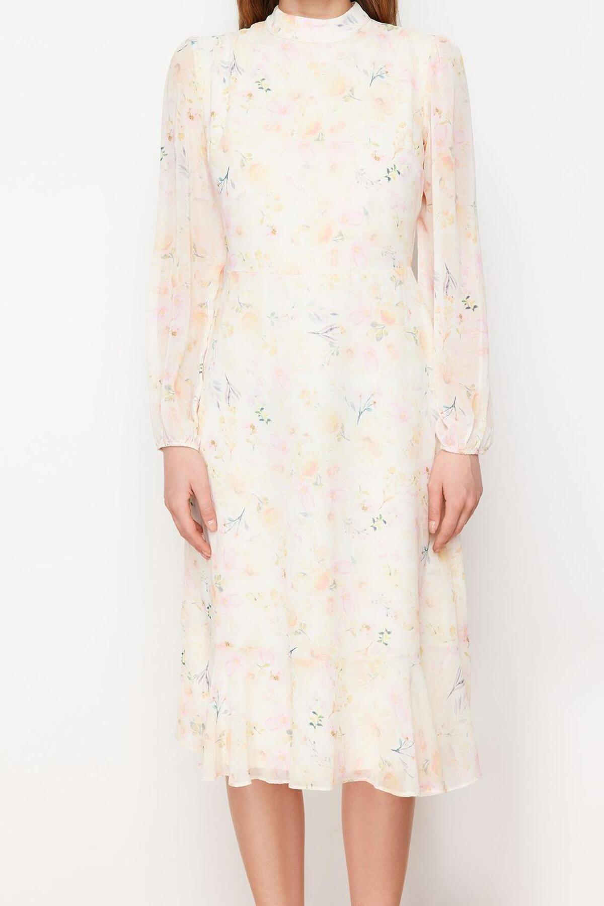 Elbisenin dik yaka tasarımı, boynu nazikçe sararak sofistike bir hava katarken, uzun kol yapısı mevsim geçişlerinde ideal bir kullanım sunar. Kolların balon kesimi, modern bir dokunuşla feminen bir detay ekler. Tamamen astarlı yapısı sayesinde iç göstermeyen bu elbise, gün boyu konforlu ve güvenli bir kullanım sağlar. Etek ucundaki fırfırlı bitiş, elbiseye dinamik bir hareketlilik ve romantik bir hava katar. Cepsiz tasarımı, elbisenin akıcı ve sade çizgisini korurken, genel estetiği tamamlar. Bakım kolaylığı sunan yapısıyla pratik bir kullanım vadeder.