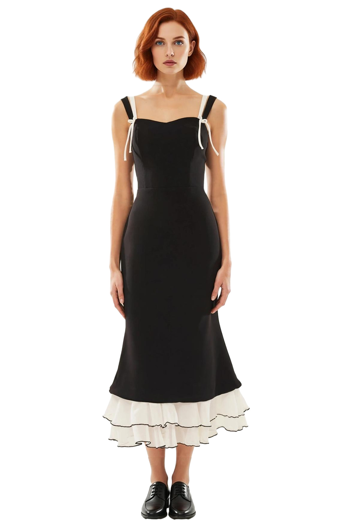 Bu zarif kadın abiye elbise, balık siluet kesimiyle vücuda oturan ve alt kısımda zarifçe genişleyen yapısıyla göz kamaştırır. %88 polyester ve %12 elastan içeren dokuma kumaşı, esneklik ve rahatlık sunarken, özel günlerde kusursuz bir duruş sağlar. Siyah ana rengi ve etek ucundaki beyaz kontrast detaylarıyla dikkat çeken renk bloklu deseni, modern bir şıklık yaratır. Kalp yaka tasarımı feminen bir hava katarken, askılardaki fiyonk detayları elbiseye özgün bir dokunuş ekler. Bu elbise, düğünler, mezuniyetler ve tüm özel davetler için mükemmel bir seçimdir.