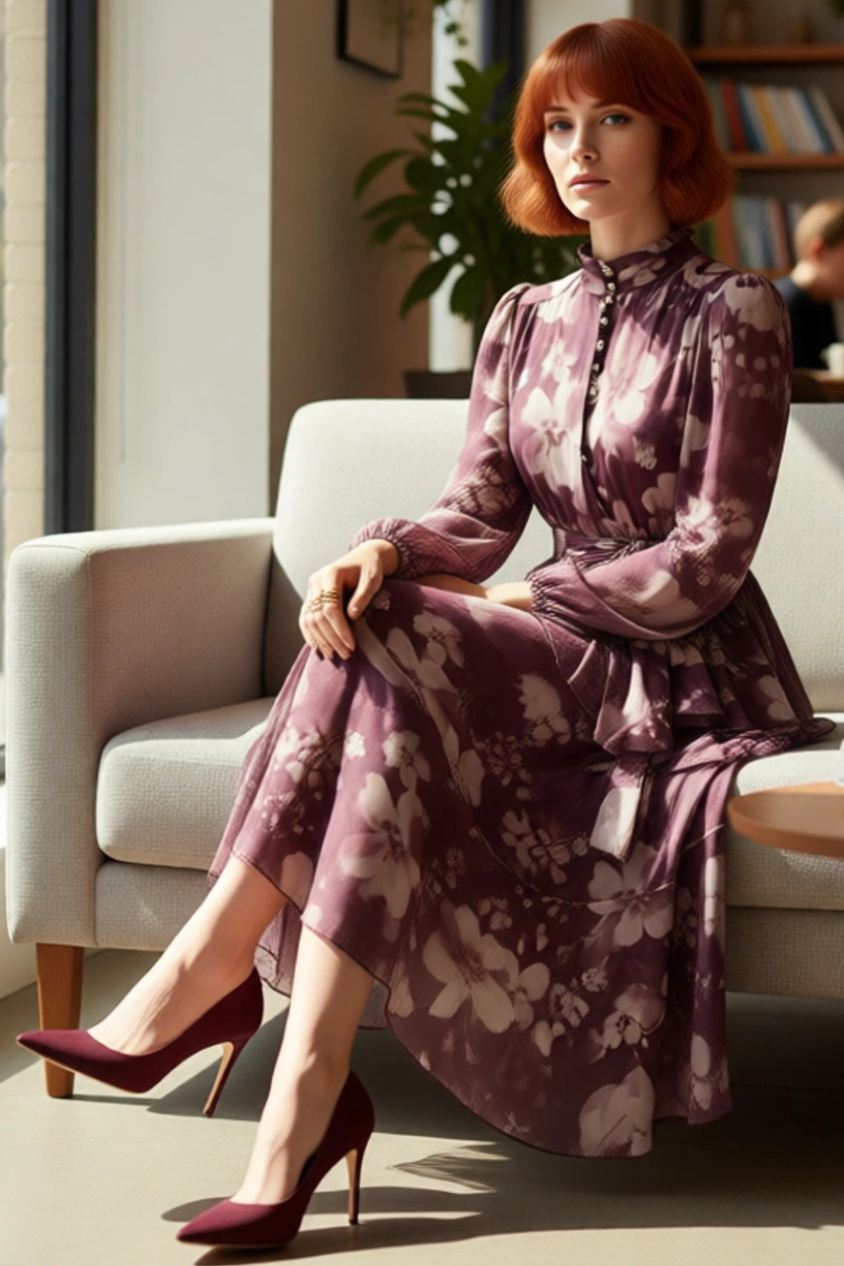 Ürün Özellikleri: Skater kalıp, %100 polyester materyal, çiçekli desen, dik yaka, balon kol, dokuma kumaş, mor renk, astarlı tasarım.