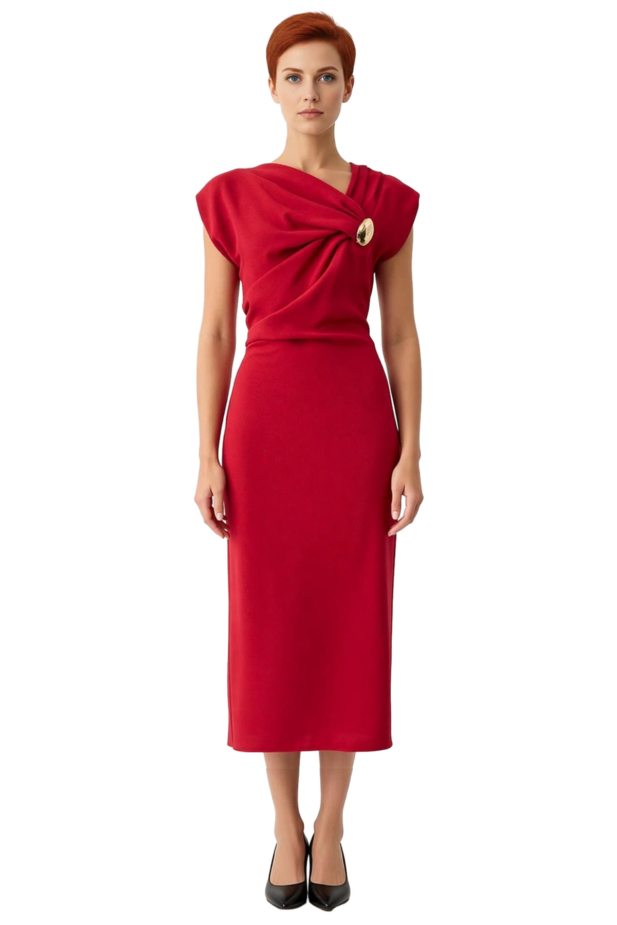 Ürün Özellikleri: Shift kalıp, 100% Polyester materyal, düz desen, degaje yaka, düşük kısa kol, dokuma krep kumaş, kırmızı renk, aksesuar detaylı, midi boy.