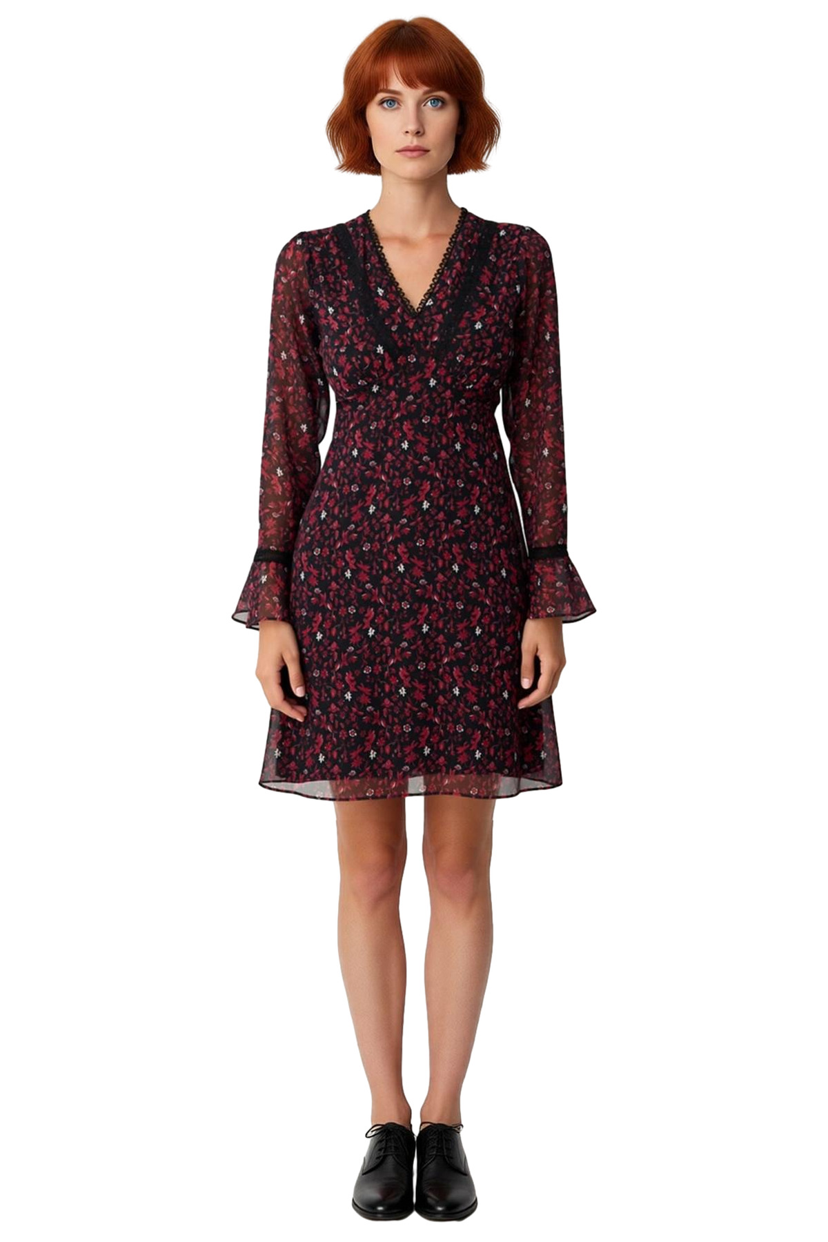 Ürün Özellikleri: Skater kalıp, 80% polyester 20% elastan materyal, çiçekli desen, V yaka, uzun standart kol, şifon dokuma kumaş, bordo renk, aksesuar detaylı.